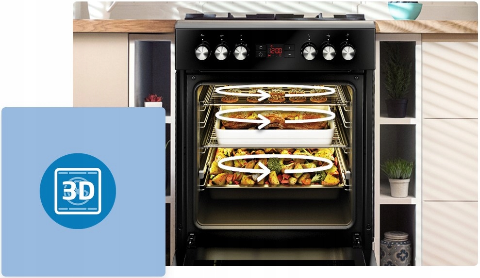 3D-выпечка — это новое поколение выпечки, которая активирует все нагревательные элементы, присутствующие в данной модели, и работает многомерно. Нагреватели духовки работают последовательно, чтобы равномерно распределить тепло по всему внутреннему пространству. 3D-выпечка также позволяет выпекать несколько блюд одновременно.