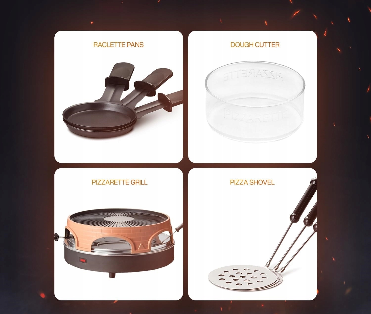 - В комплект поставки входят 6 круглых форм для раклета, 6 круглых лопаток для пиццы и 1 нож для теста для пиццы.