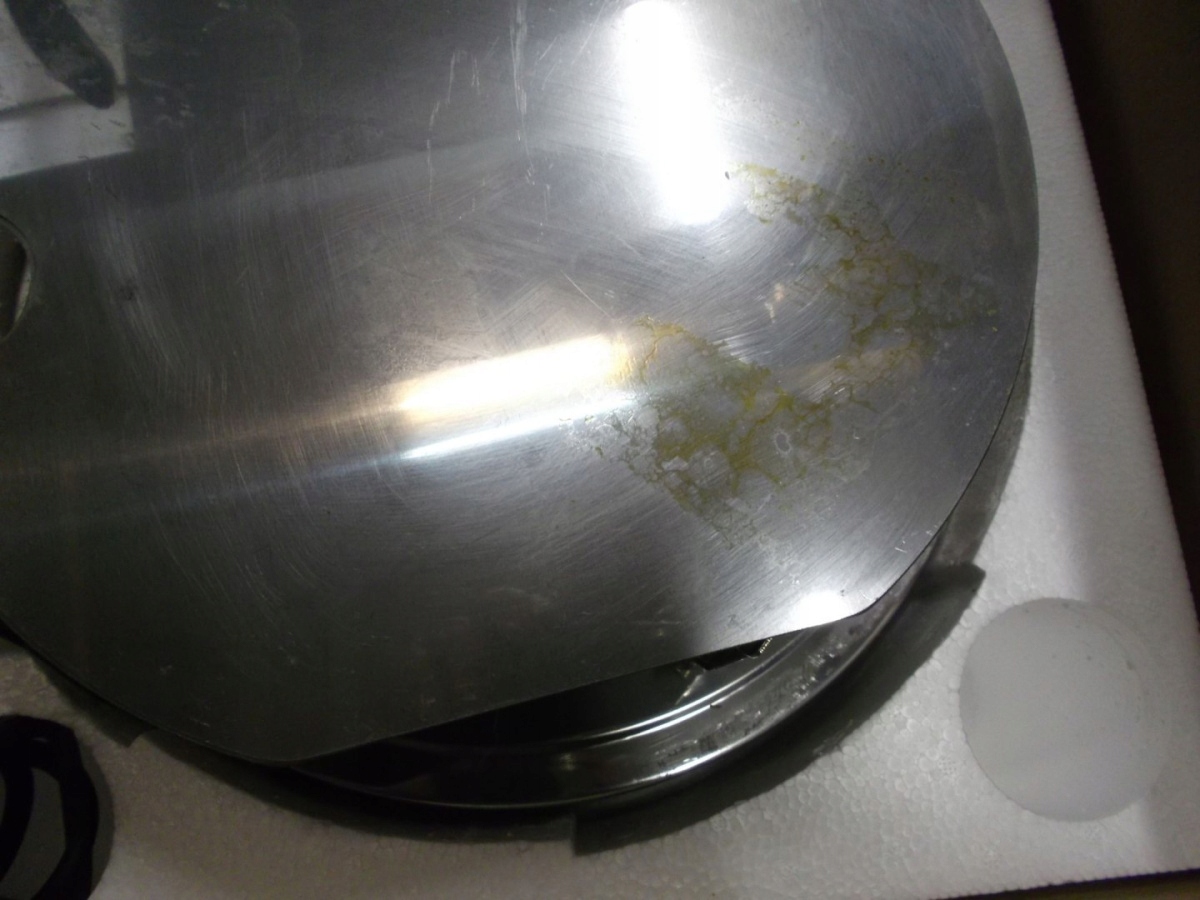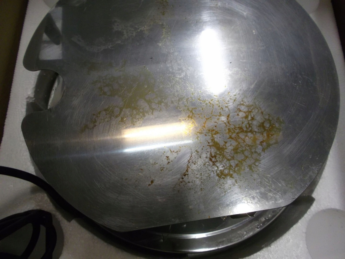 Предмет, выставленный на аукцион, имеет сломанный фрагмент терракотового купола, трещину на куполе, царапины на основании, темные пятна на подносах, фактическое состояние видно на фотографиях.