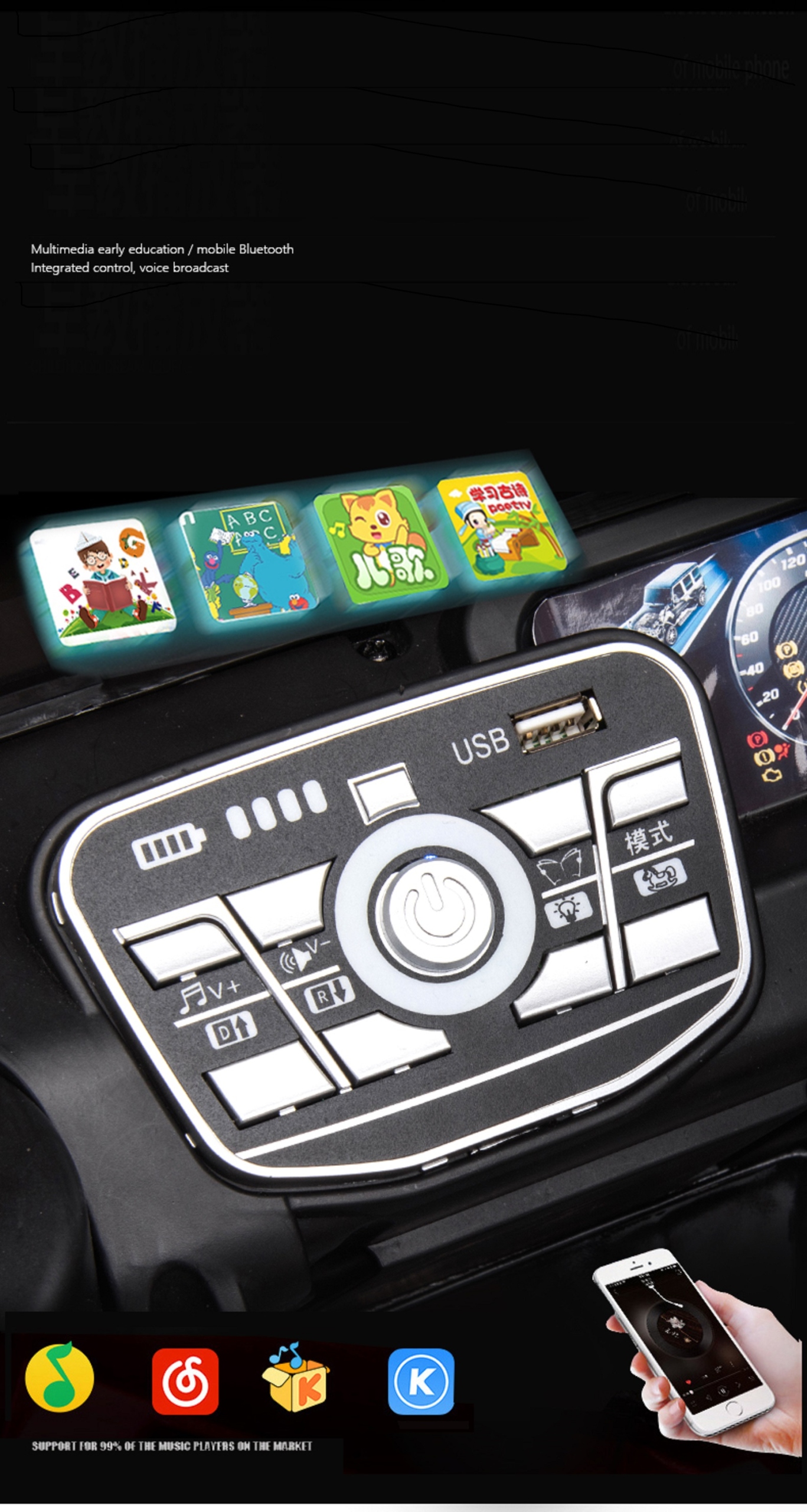 Автомобиль оснащен звуковым рулевым колесом - звук гудка, запуска двигателя и различные мелодии. Дополнительная музыкальная панель позволяет подключать любимую музыку через порт USB/AUX. В автомобиле есть светодиодные фонари, индикатор заряда аккумулятора и часы с подсветкой.