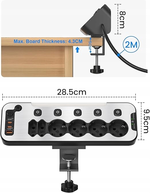 Настольный удлинитель — идеальное решение для людей, которые ценят порядок, функциональность и защиту электронного оборудования. Оснащенный 6 розетками с независимыми выключателями, защитой от перенапряжения и портом PD мощностью 20 Вт, он обеспечивает удобство, безопасность и быструю зарядку устройств. Благодаря алюминиевому основанию и кабелю длиной 2 м он надежен в офисе, доме и других рабочих помещениях.