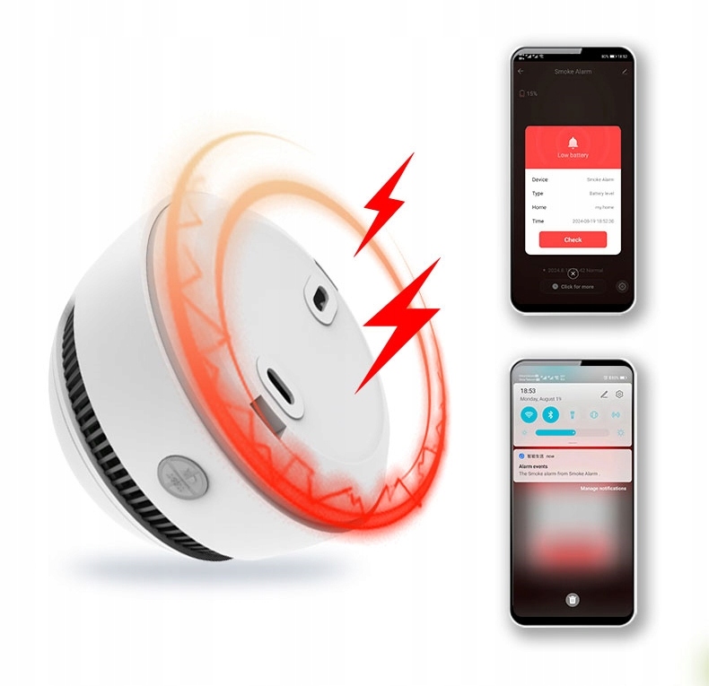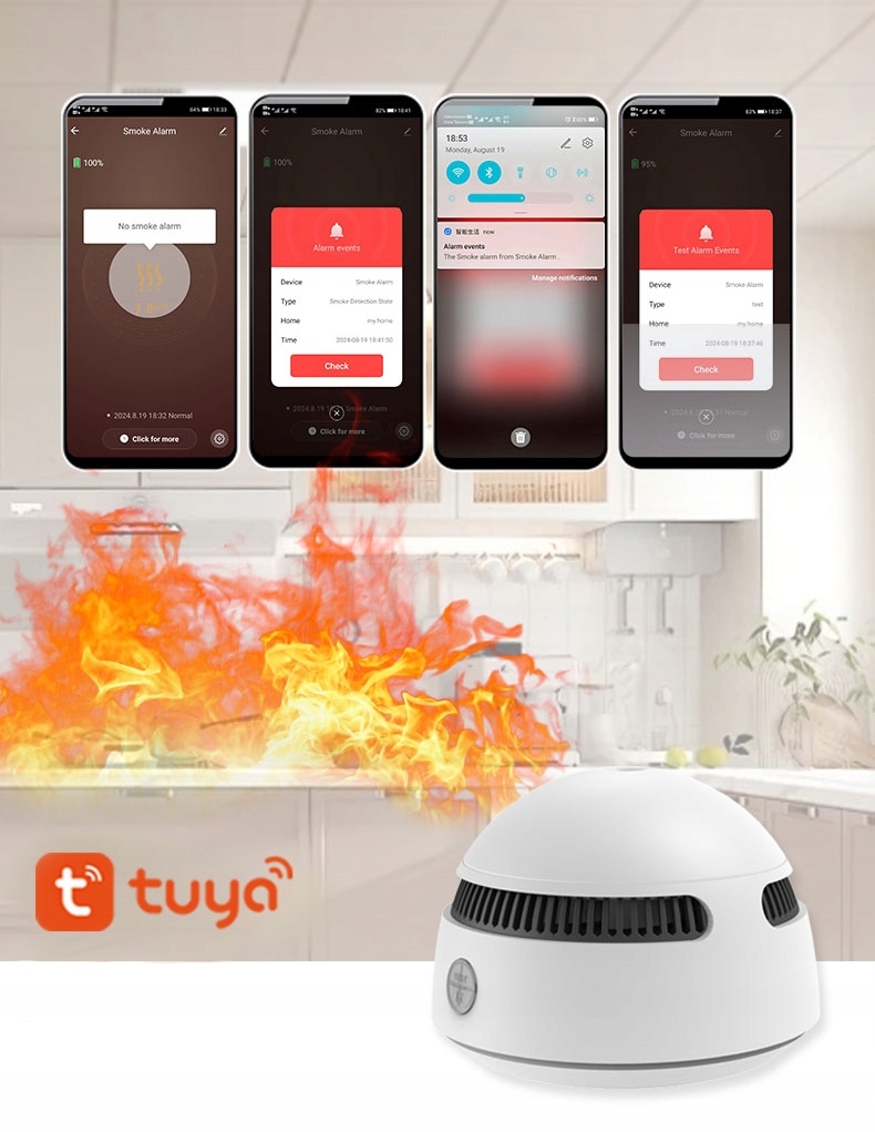 "Оставайтесь на связи! Наша сигнализация дыма легко интегрируется с Tuya через Wi-Fi. Получайте мгновенные push-уведомления прямо на свой телефон при обнаружении дыма - независимо от того, находитесь ли вы дома или вдали. Отслеживайте состояние, просматривайте оповещения и управляйте настройками удаленно с помощью вашей ладони. "