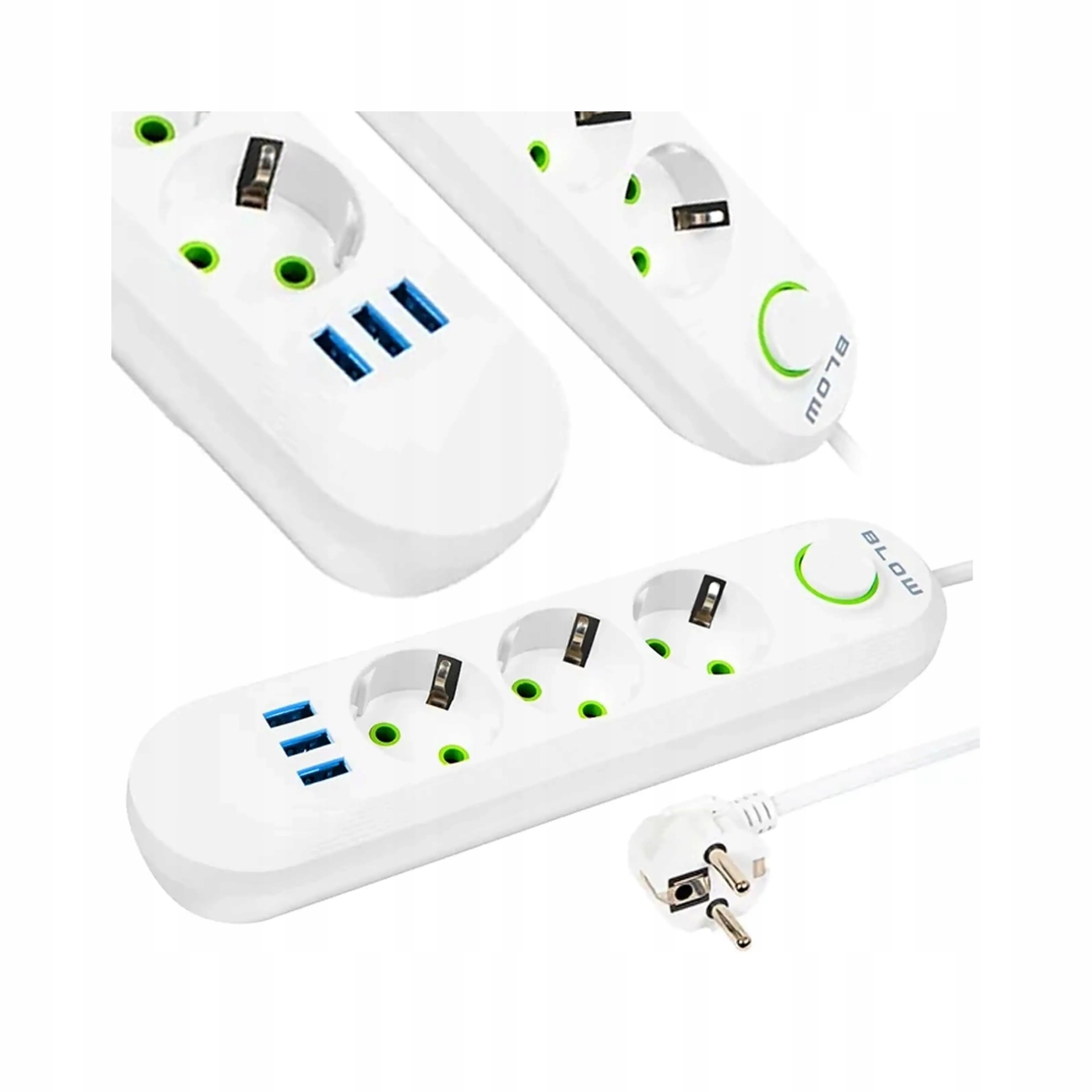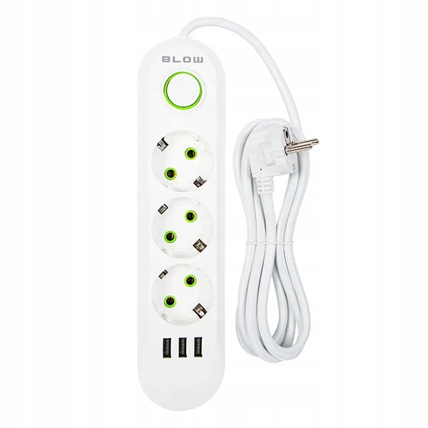 Удлинитель BLOW белого цвета с тремя розетками предназначен для домашнего использования. Удлинитель позволяет подключать устройства, находящиеся далеко от электрической розетки. С одной стороны изделие имеет три расположенные под углом розетки и выключатель, а с другой — одну угловую вилку питания. Кроме того, на полоске имеются три USB-разъема для зарядки таких устройств, как смартфон.