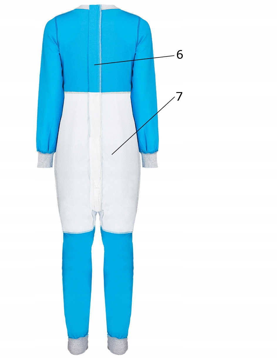 - очень легкая смена подгузников и уход за пациентом благодаря использованию молнии, идущей от манжеты один комбинезон, через переднюю часть комбинезона до манжеты другого штанин