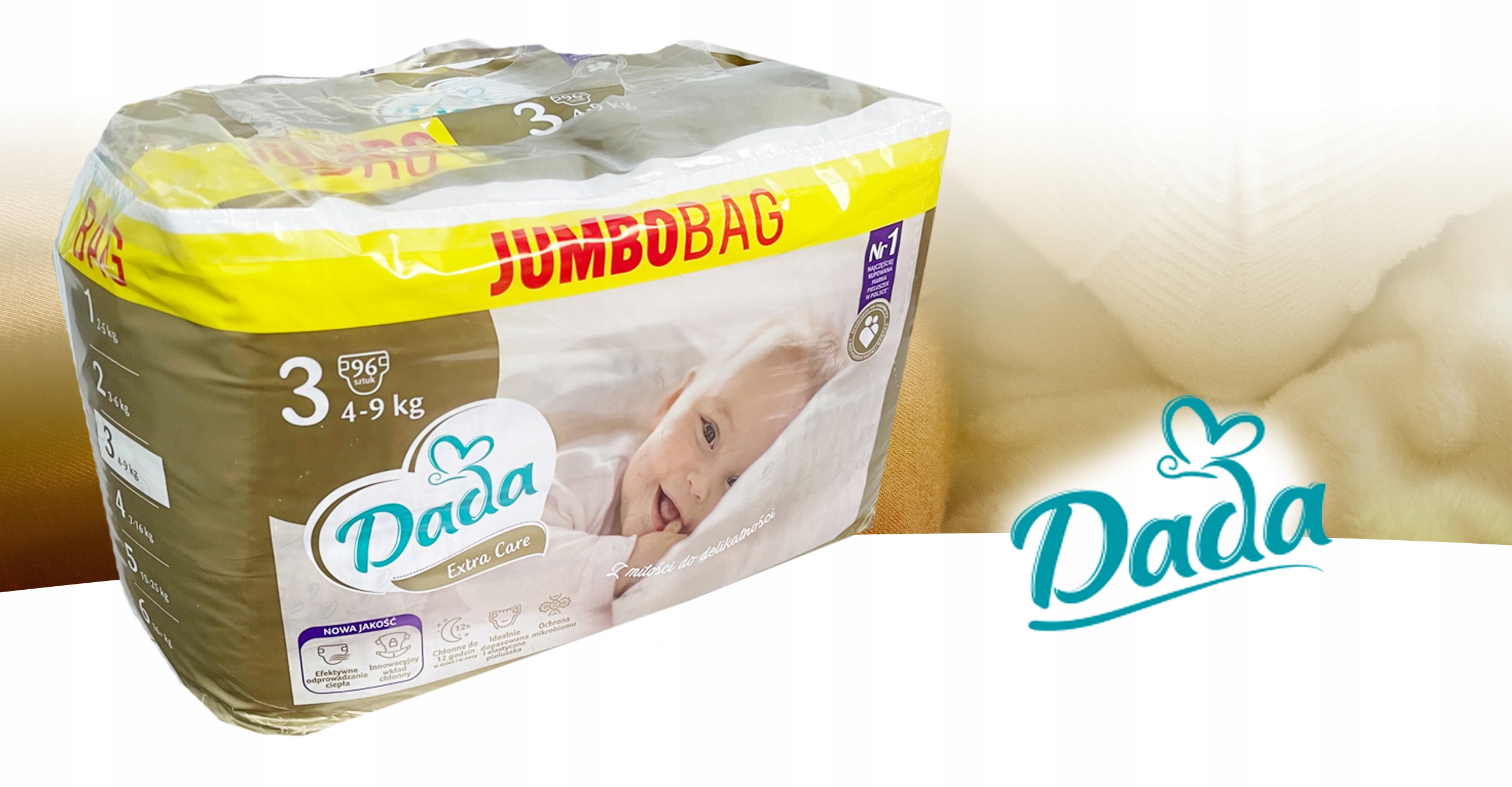 Увеличенная упаковка для вашего малыша! Большая упаковка ваших любимых подгузников Dada Extra Care 3 подарит вам больше спокойствия! Подгузники DADA EXTRA CARE 3 — единственные подгузники в Польше, созданные в сотрудничестве с Институтом матери и ребенка.