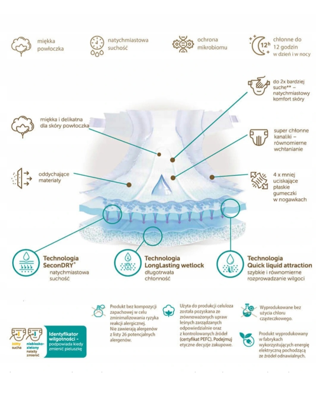 Подгузники производятся без использования молекулярного хлора и ароматизаторов, чтобы свести к минимуму риск возникновения аллергических кожных реакций.
