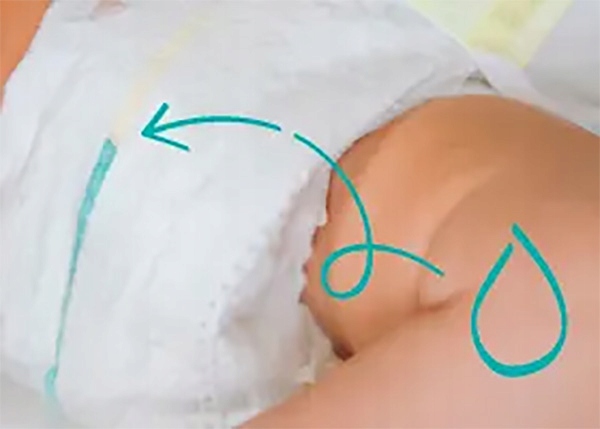 Покрытие DermaComfort с впитывающими каналами отводит влагу и содержимое подгузника от кожи ребенка, удерживая их внутри подгузника.