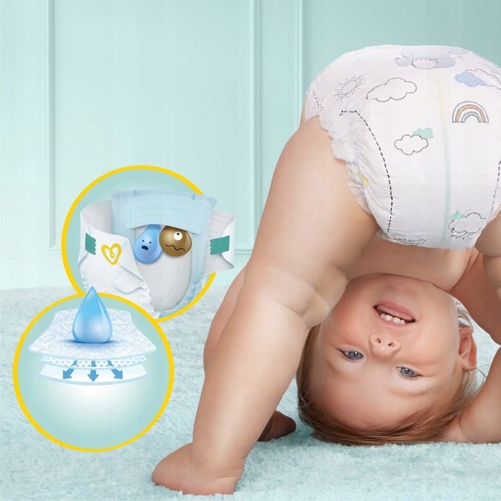 - ПОСТОЯННОЙ АБСОРБАЦИИ - с миллионами впитывающих микропор подгузника постоянно впитывают влагу влагу и грязь, предохраняя их от кожи изапирая глубоко в подгузнике. Нежная кожа вашего ребенка сухая и безопасная.