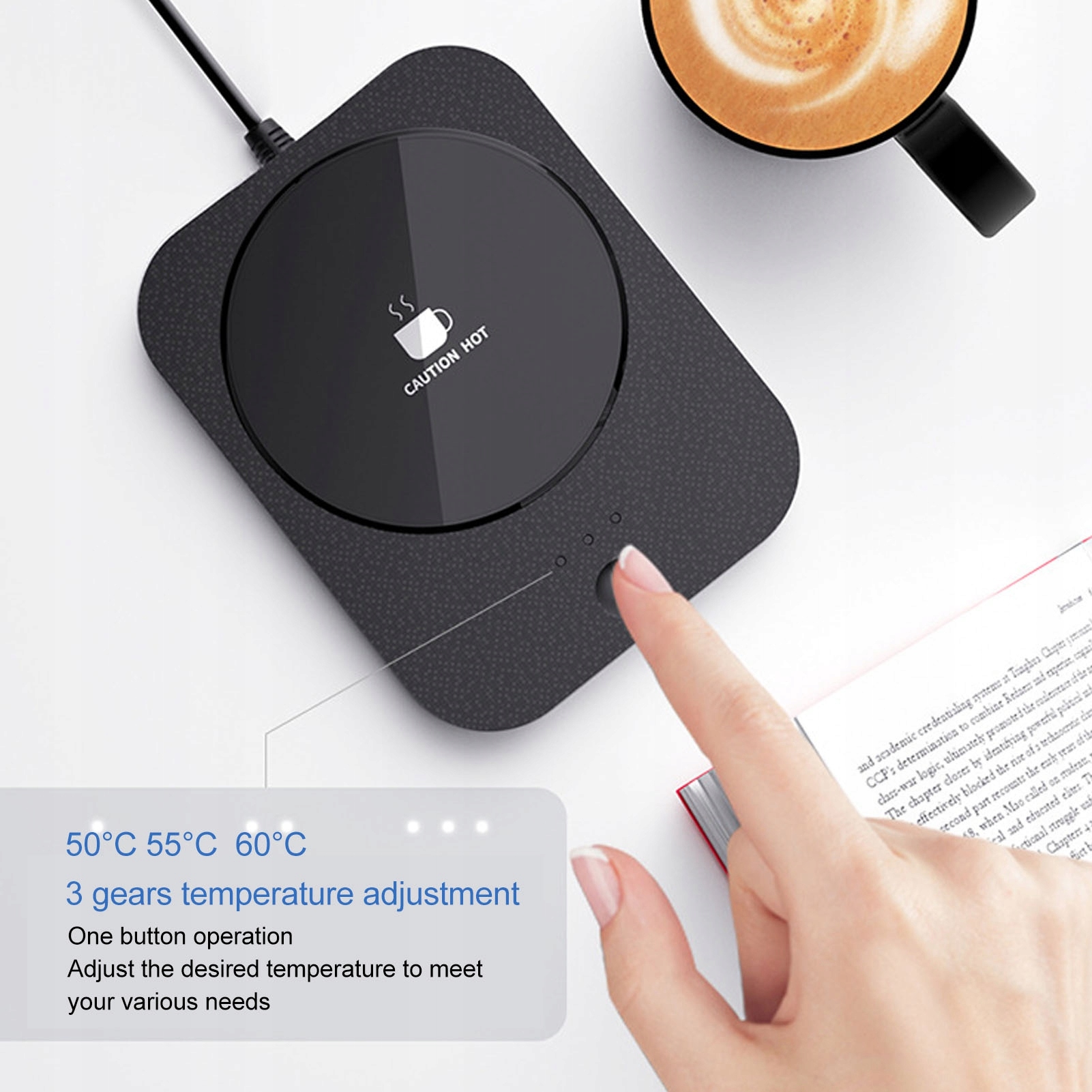 1. 3-ступенчатый контроль температуры: электрический подогреватель кружек имеет 3-ступенчатую регулировку температуры в диапазоне от 50 ℃ (122 ℉); 55℃(131℉); 60℃ (140℉). Операция одним щелчком мыши позволяет настроить желаемую температуру в соответствии с различными потребностями.