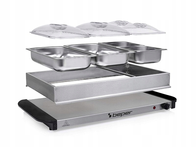 Beper P101TEM002 — элегантный и функциональный подогреватель для шведского стола, идеально подходящий для поддержания нужной температуры продуктов без риска их подгорания. Благодаря своей универсальности устройство идеально подходит для семейных встреч, вечеринок, торжеств и мероприятий на открытом воздухе. Оснащен четырьмя съемными контейнерами из нержавеющей стали (два емкостью 2,4 л и две емкостью 1,1 л), а также прозрачными крышками, позволяет подавать различные блюда одновременно. После снятия контейнеров устройство можно использовать как большую плиту, где можно сохранять еду теплой прямо в кастрюлях или на тарелках. Для удобства пользователей Beper P101TEM002 оснащен регулируемым термостатом с контрольной лампочкой, позволяющей точно устанавливать температуру, и теплоизолирующими ручками, облегчающими транспортировку.