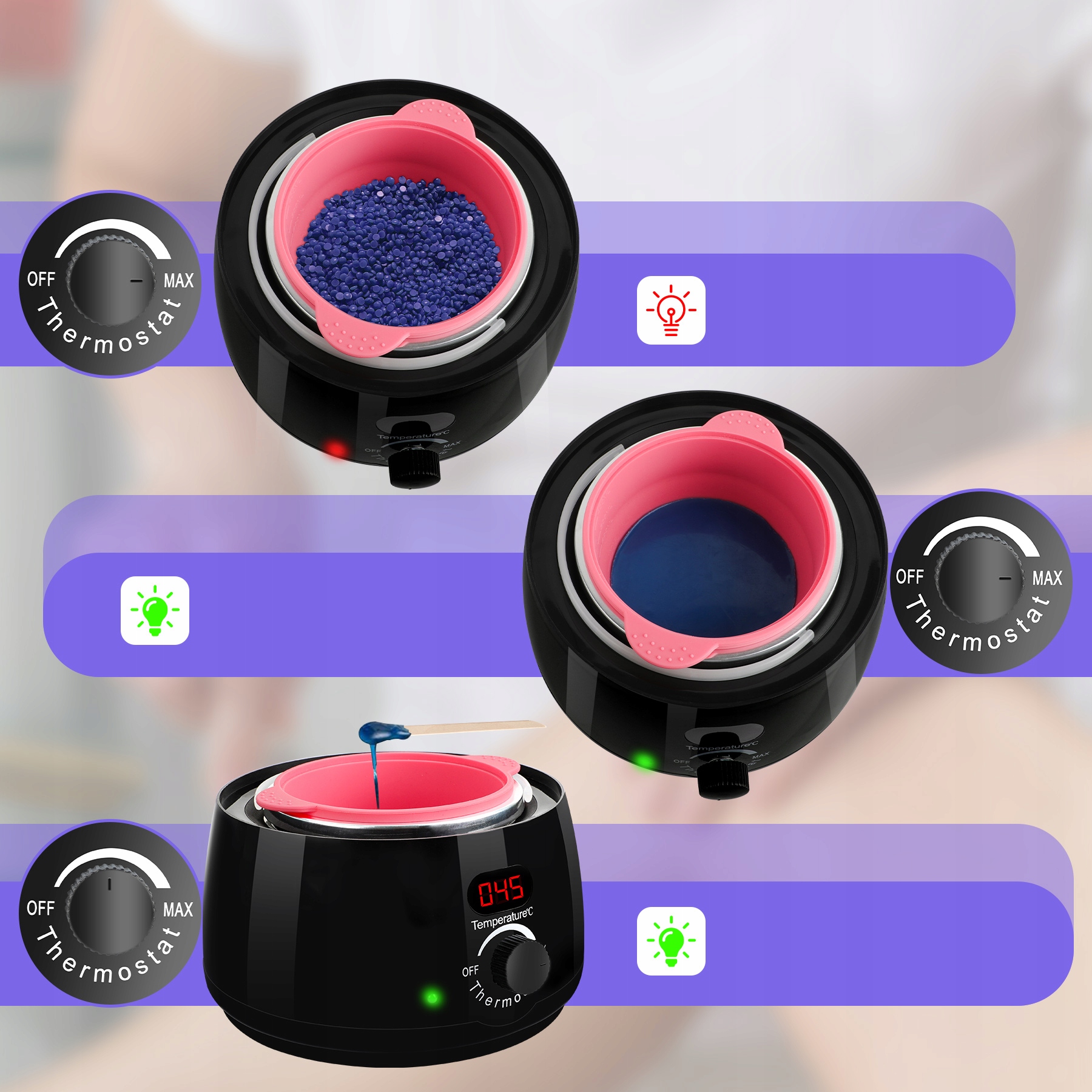 Натуральные ингредиенты подходят для депиляции линии бикини, восковой плавки, бразильской депиляции, депиляции лица. Воск быстро тает и подходит для всех типов кожи и волос. Расплавитель легко чистится и очень удобен в использовании.