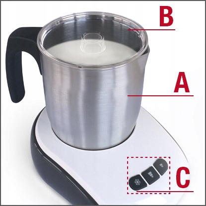Нажмите кнопку питания (C), расположенную в верхней части нагревательного основания (выберите предпочитаемую программу: «холодная», «горячая», «очень горячая»). Устройство автоматически выключится, когда пена будет готова.