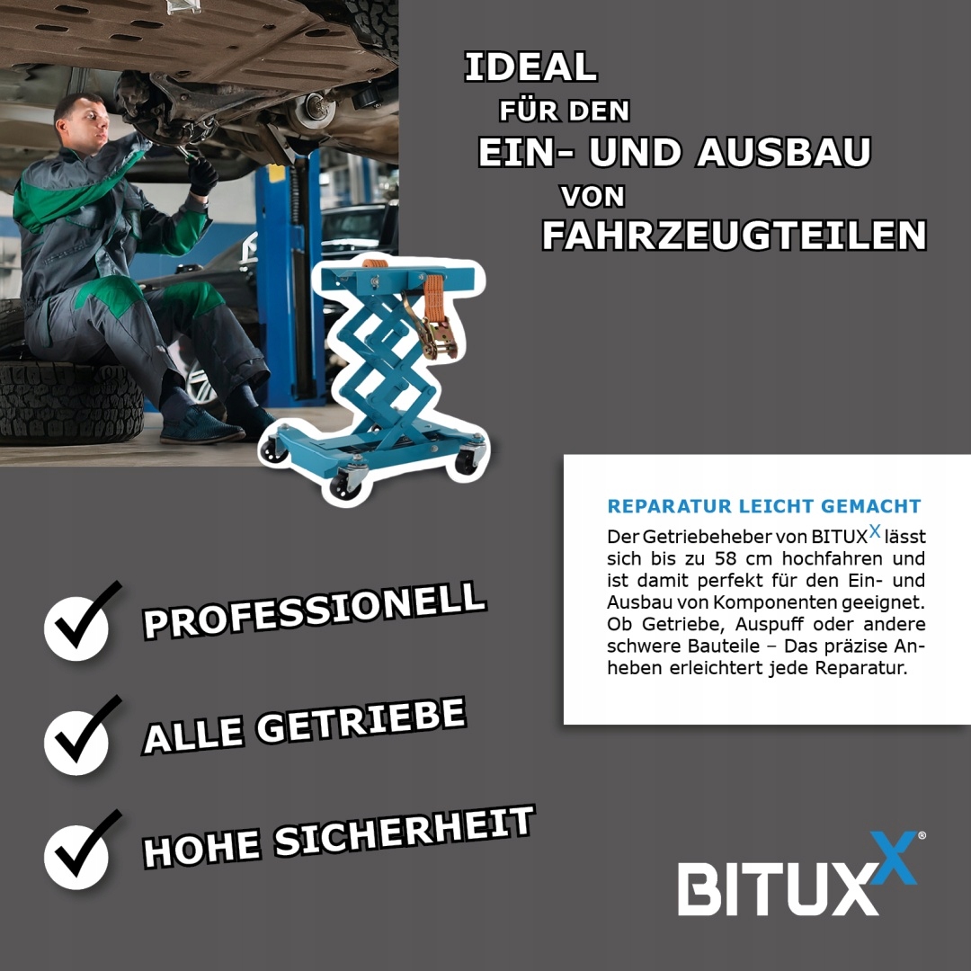 Гидравлическая подъемная коробка передач ("Getriebehebeber"), разработанное для профессиональных семинаров и амбициозных DIY. Он облегчает разборку и установку коробок передач и тяжелых компонентов системы привода, обеспечивая стабильную и безопасную поддержку. Отличается стальной конструкцией, регулированием высоты и безопасностью безопасности.