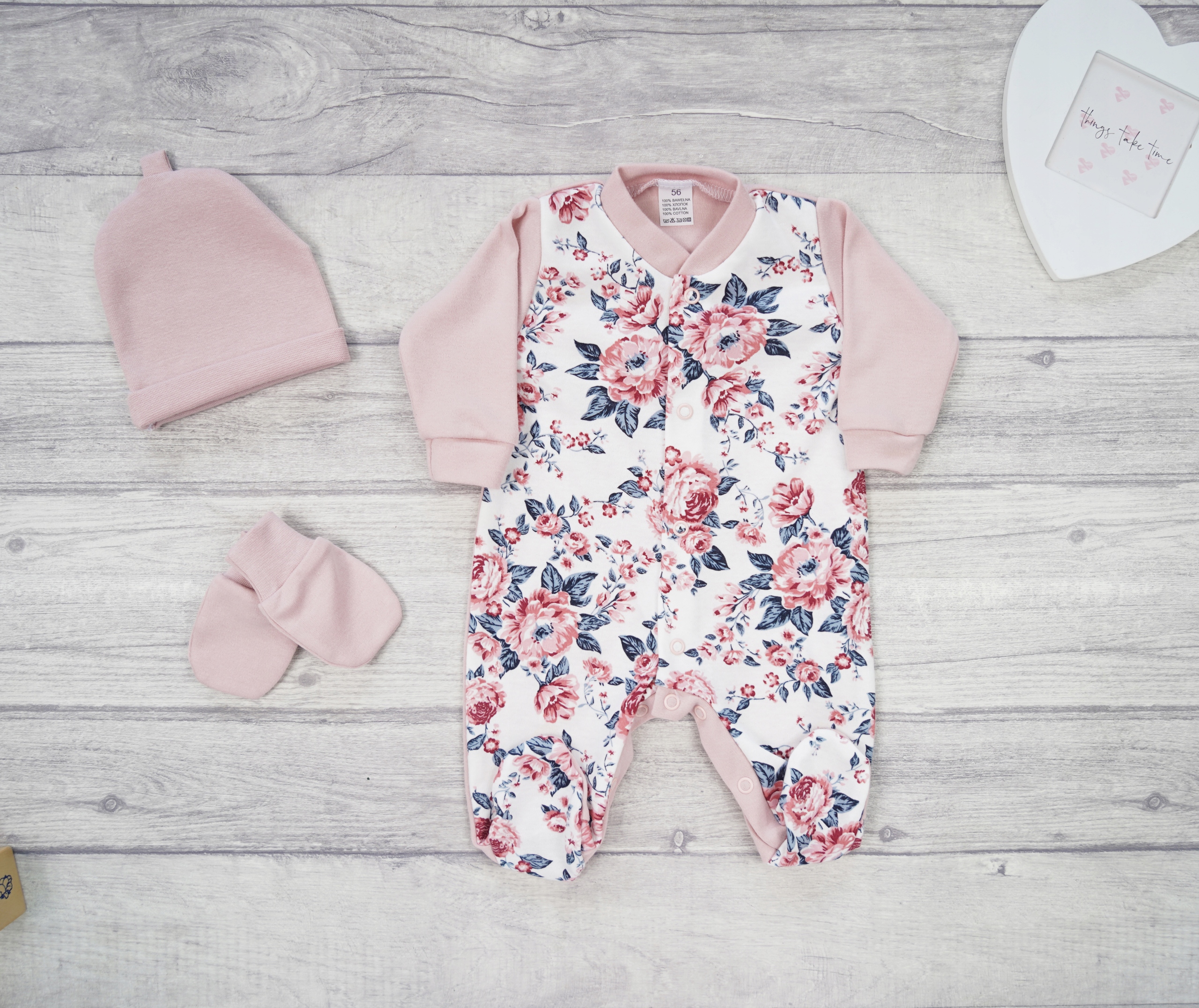 Детский комплект из 5 предметов, пудрово-розовый с цветами и листьями - клоун, боди-конверт, комбинезон, шапочка, лапки.