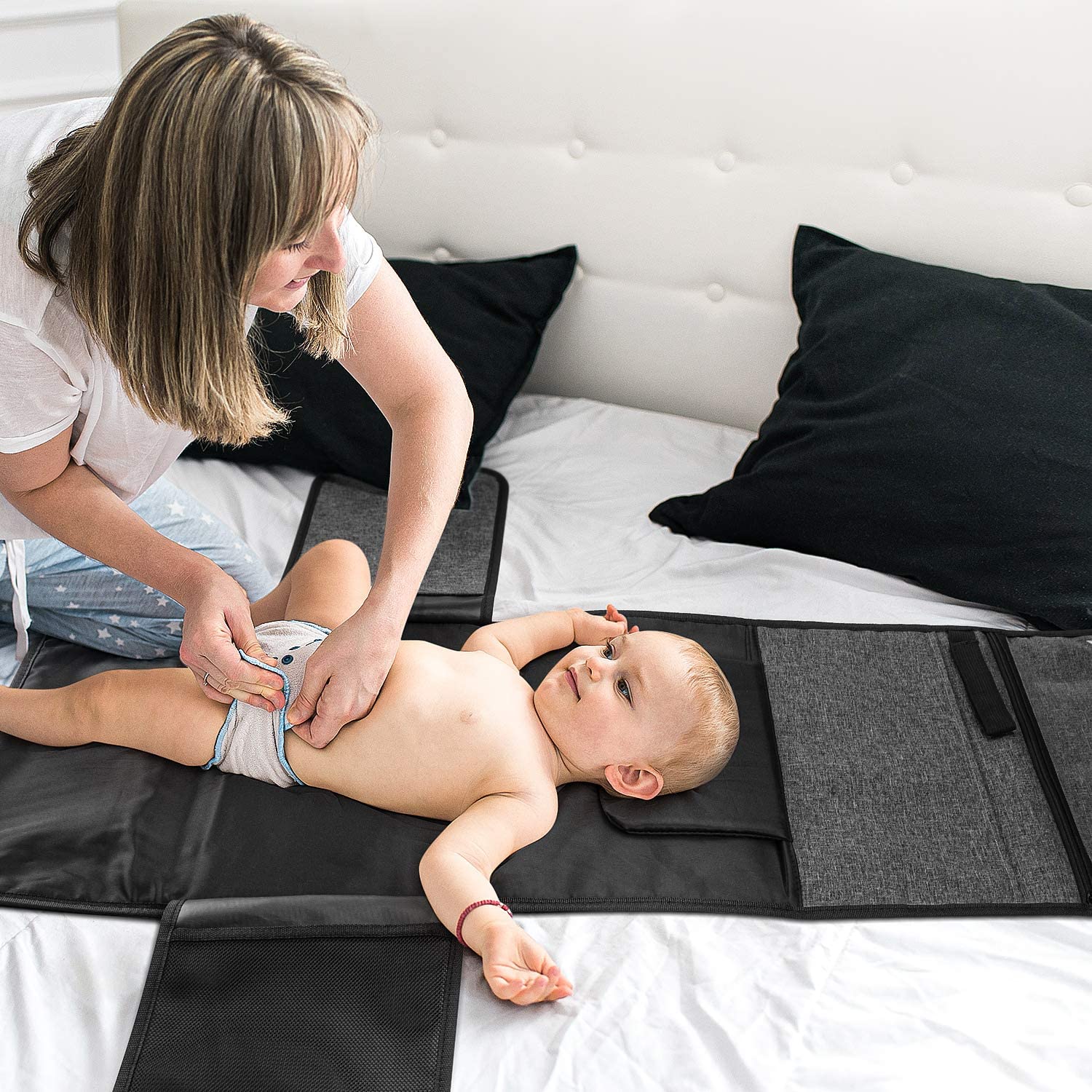 - Большая вместимость: складную пеленальную подушку легко носить с собой в путешествиях дома, она имеет 5 карманов, 1 большую сумку для подгузников, 1 прозрачный карман. с застежкой-липучкой для кремов, детского масла и 1 большим внутренним карманом для детской одежды, 1 открытым тканевым карманом, 1 наружным карманом на молнии для телефона, ключей.
