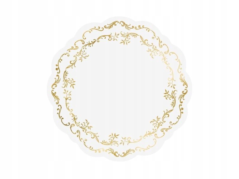 Коврики односторонние белые с золотым орнаментом. Диаметр ок. 35,5 см. В комплект входит 6 подушечек. Продукт одноразового использования. Изготовлен из водостойкой синтетической бумаги. (1 упаковка / 6 шт.)