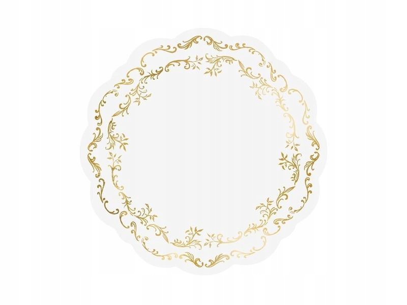 Коврики односторонние белые с золотым орнаментом. Диаметр ок. 35,5 см. В комплект входит 6 подушечек. Продукт одноразового использования. Изготовлен из водонепроницаемой синтетической бумаги. (1 упаковка/6 шт)