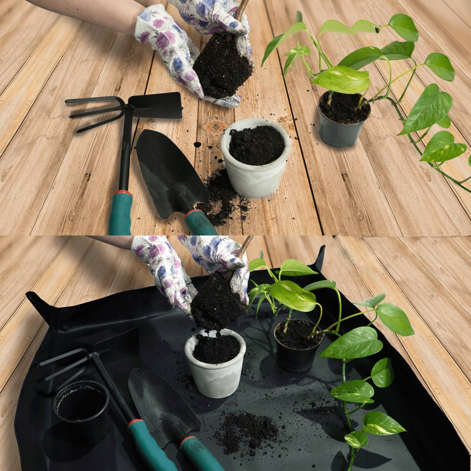 Самым большим преимуществом нашего коврика является то, что он имеет защелки по углам, которые позволяют складывать его в форме «чаши». Благодаря этому вы можете безопасно и удобно пересаживать растения, не беспокоясь о разливе почвы или воды. . Коврик обеспечивает устойчивость и защиту ваших растений, а также защищает пол или стол от повреждений. С нашим ковриком вы можете пересаживать растения где угодно и в любое время.