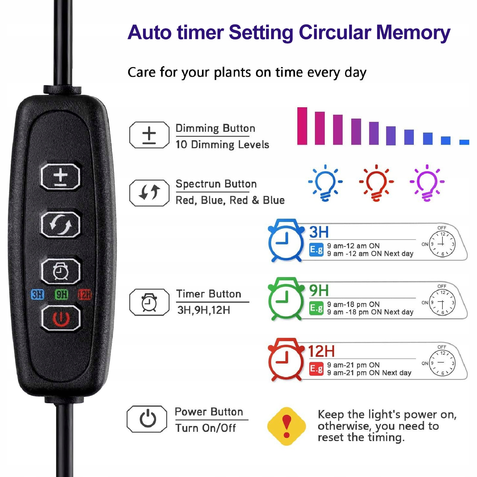 5. Функция времени: это освещение для выращивания растений имеет функцию измерения времени, которая может быть установлена на различные периоды, например, 3 часа, 9 часов, 12 часов и т. Д.