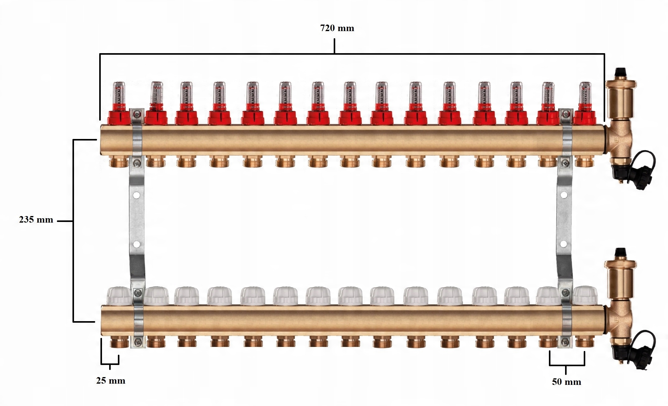 Напольный распределитель из латуни с вентиляционным комплектом на 15 контуров
