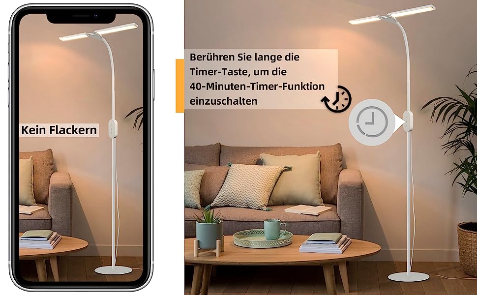 【Функция памяти и таймер】 Торшер для чтения имеет функцию памяти, которая автоматически поддерживает последнюю установленную цветовую температуру и яркость, когда питание всегда включено. Кроме того, торшер имеет функцию таймера на 40 минут. Нажмите и удерживайте кнопку таймера, торшер мигнет 2 раза, в это время функция таймера включена и автоматически выключится через 40 минут.