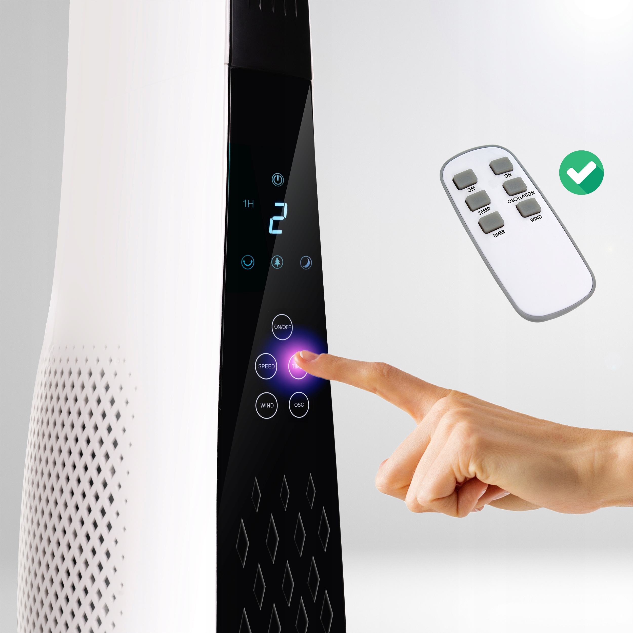 Многофункционален. Отдельностоящий вентилятор с тремя скоростями, 3 режимами работы, таймером до 15 часов и поворотной функцией. На корпусе имеются удобные сенсорные кнопки, также устройством можно управлять с помощью пульта дистанционного управления.
