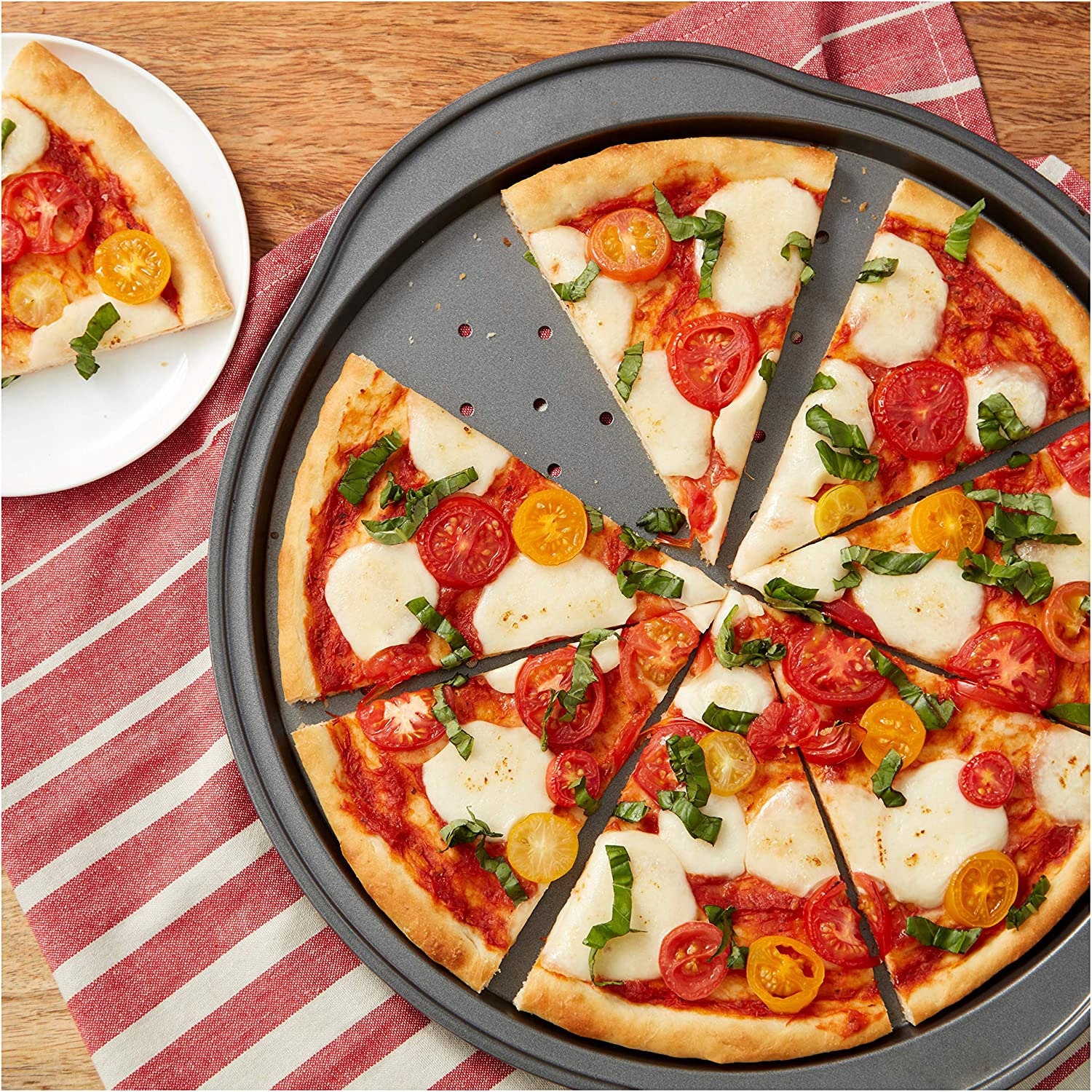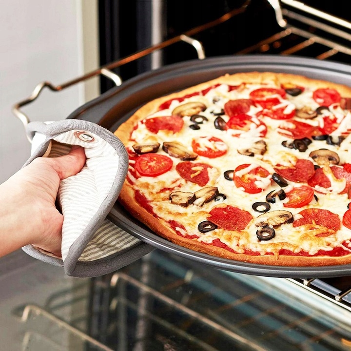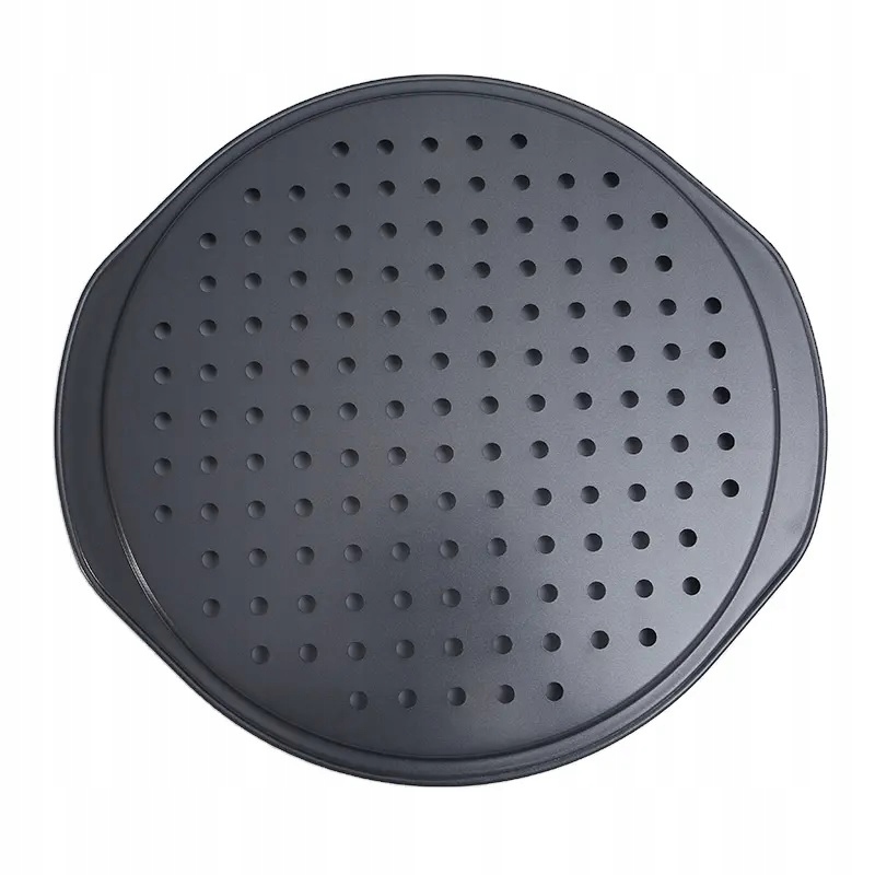 Противень для выпечки пиццы прекрасно выполняет свою роль. Благодаря антипригарному специальному покрытию вынимать кусочки торта легко и просто. Противень нагревается равномерно, а его перфорация обеспечивает хрустящую основу для пиццы. Толстые края предотвратят деформацию. Для сохранения его свойств лучше всего использовать деревянную или силиконовую посуду.