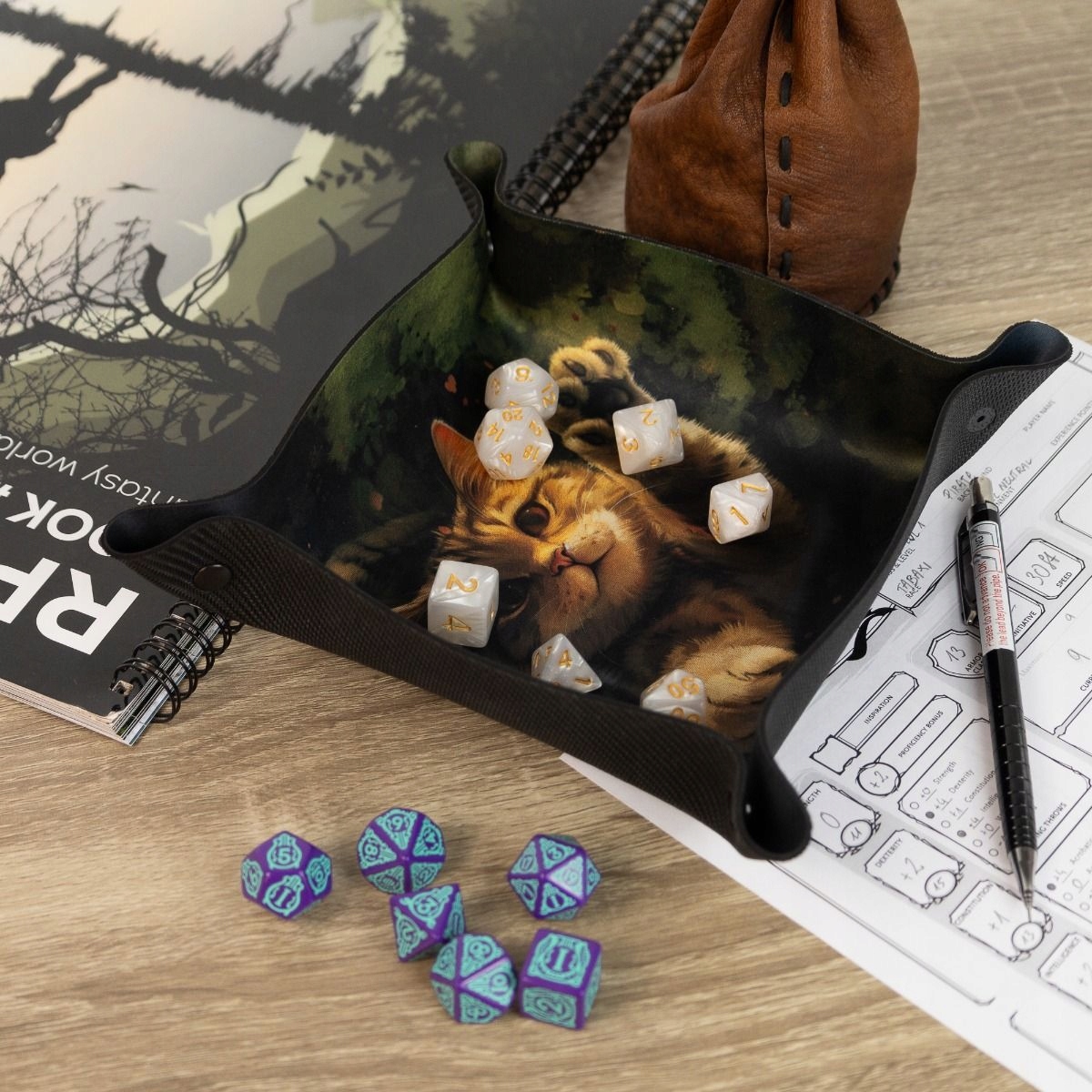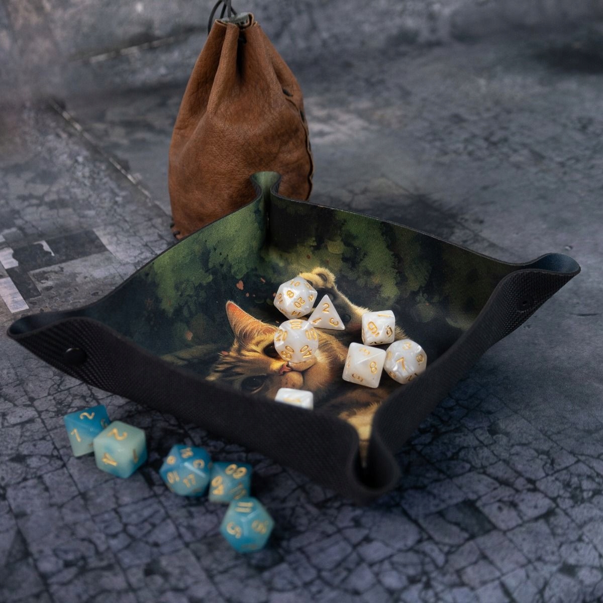 Добавьте очарования своим сеансам ролевой игры с помощью лотка для кубиков «Играющий кот». Изготовленный из прочного материала и украшенный милым рисунком играющего кота, этот поднос не только защитит ваши игральные кости от потери, но и добавит в игру приятную атмосферу. Удобные защелки позволяют быстро складывать и раскладывать.