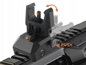 Прицельные приспособления со складными пружинными частями и шестигранным ключом, вставным креплением и возможностью наклона вверх/вниз. Имеется основная кнопка для установки мушки и резервного прицела на направляющую, а в футляр входит шестигранный ключ. Откидной прицел для удобного прицеливания, установленный распределитель и аккумулятор