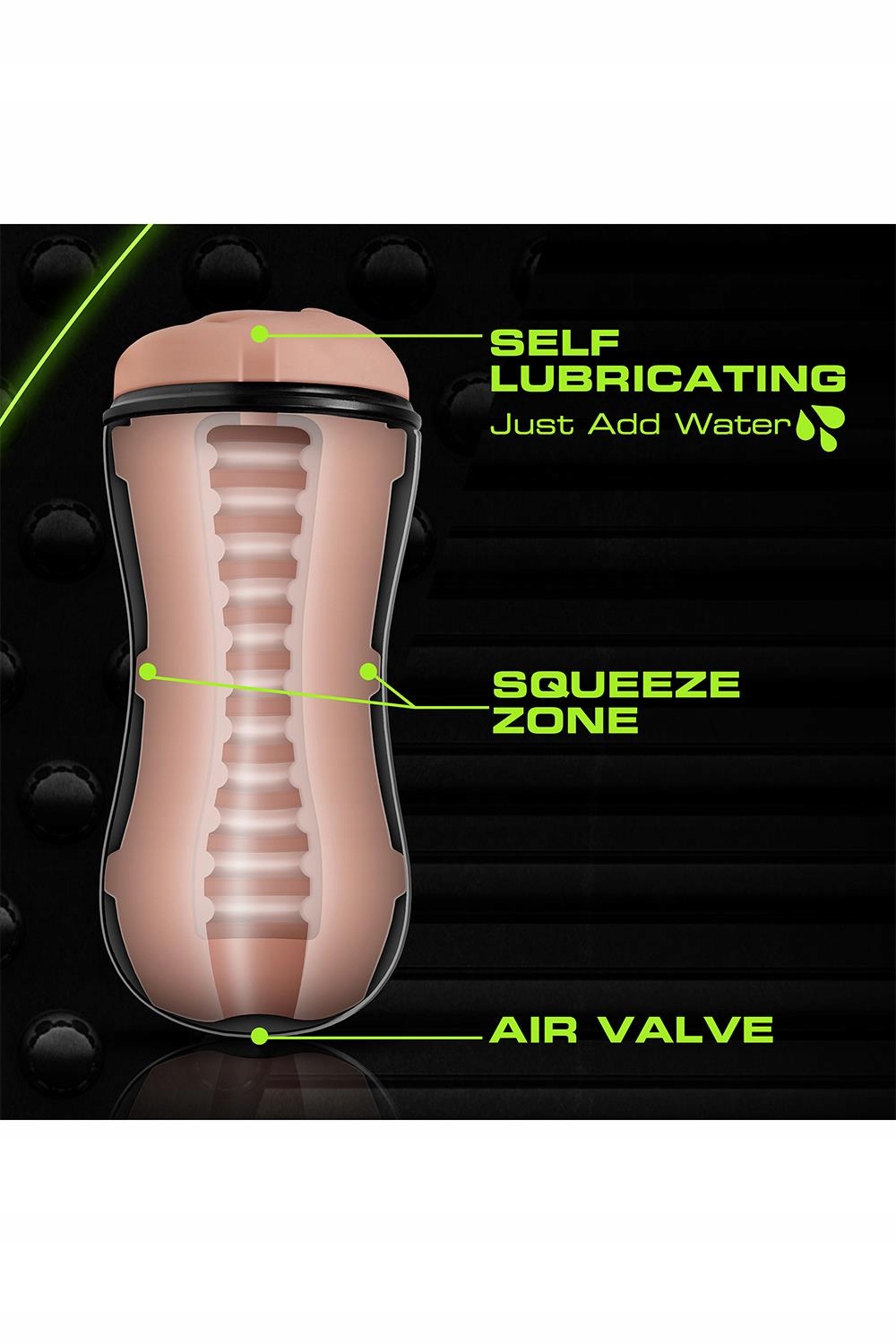 - самосмазывающийся: скользкий во влажном состоянии, просто добавьте немного воды и вставьте пенис в текстурированную внутреннюю часть: наслаждайтесь эротическими ощущениями, когда выступы массируют ваш пенис. вал