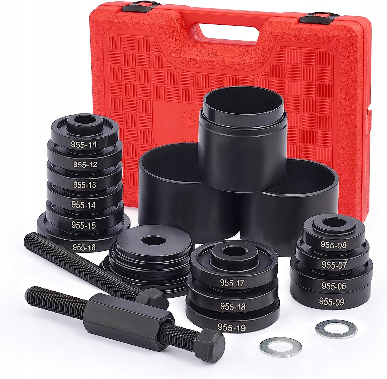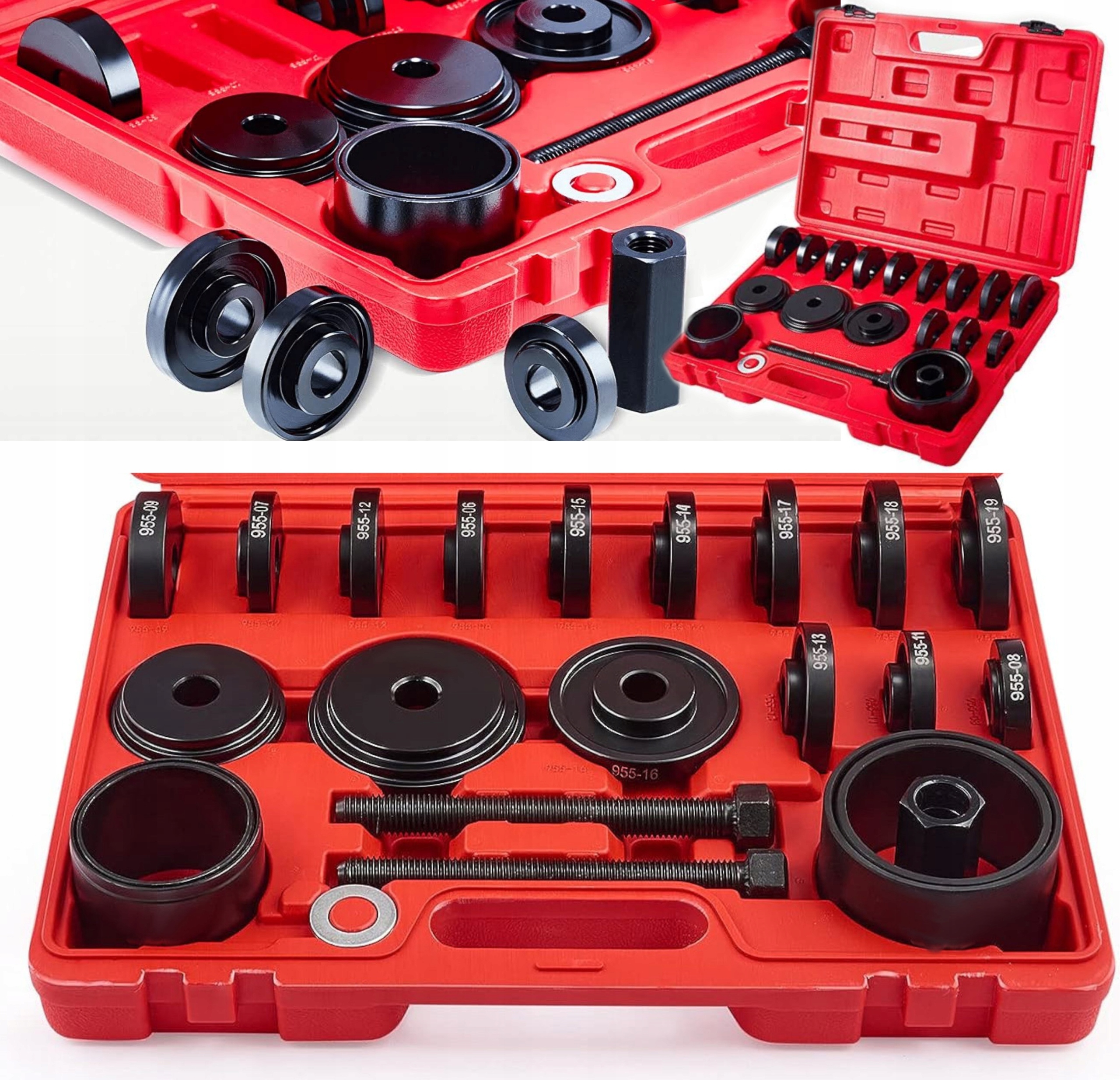 - Комплект предназначен для монтажа и демонтажа подшипников в поворотных кулаках и втулках подвески. В комплект входит винтовой пресс и адаптеры. Все в элегантном и удобном чемодане.