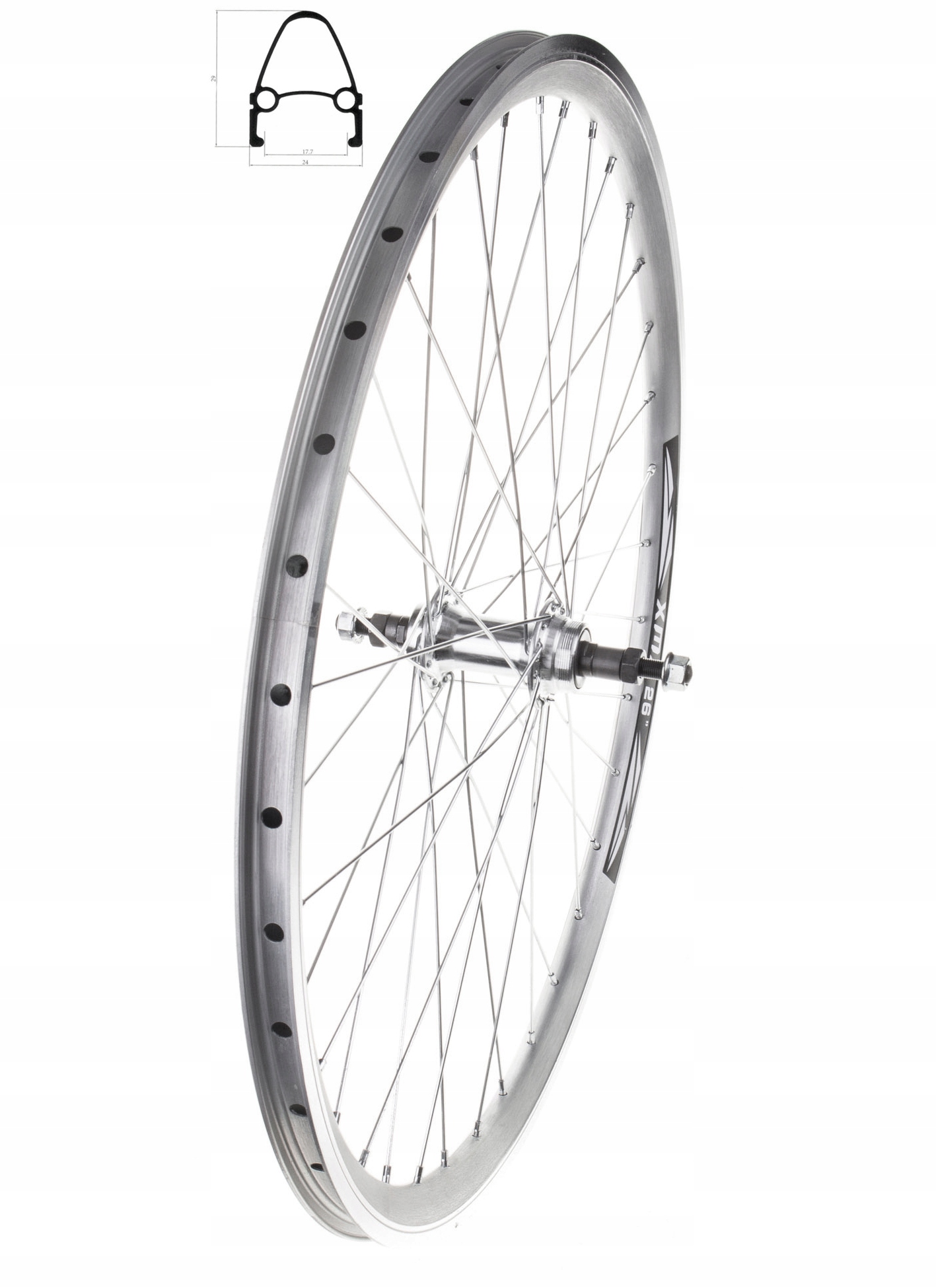 Высококачественное алюминиевое заднее велосипедное колесо XMX серебристого цвета. Колесо состоит из обода, ступицы и 36 спиц. 26-дюймовый конический обод с двойными стенками без проушин адаптирован для тормозов V-Brake. На нем имеется специальная канавка, сообщающая о степени износа и необходимости замены тормозных колодок. Алюминиевая ступица XMX имеет картриджные подшипники и ось из материала CrMo размером M10 x 180 мм с винтовым креплением. Подходит для 36 спиц диаметром 2 мм. Велосипедное колесо XMX отличается высокой прочностью, долговечностью и в то же время легкостью. Он очень хорошо управляется на неровной и более сложной местности. Он гарантирует безопасную и плавную езду благодаря высокому качеству используемых материалов и прочности всех компонентов. Руль предназначен для велосипедов MTB, ATB, CITY.