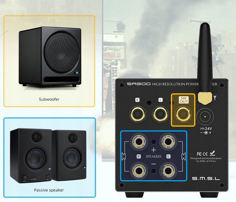 Устройство также имеет выход на сабвуфер. Подключив его к SA300 вместе с парой стереодинамиков, вы создадите настоящую аудиосистему 2.1.