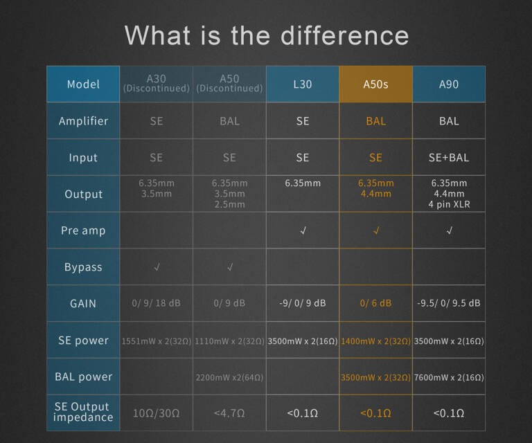 A50s поставляется с двумя настройками усиления: 0 дБ/6 дБ на выходе SE (6 дБ/12 дБ на балансном выходе). Широкий диапазон настроек усиления и сверхнизкий уровень шума 0,3 мкВ (среднеквадратичное значение) позволяют A50 легко адаптироваться ко всем типам наушников: от чрезвычайно чувствительных внутриканальных IEM до самых требовательных полноразмерных наушников.