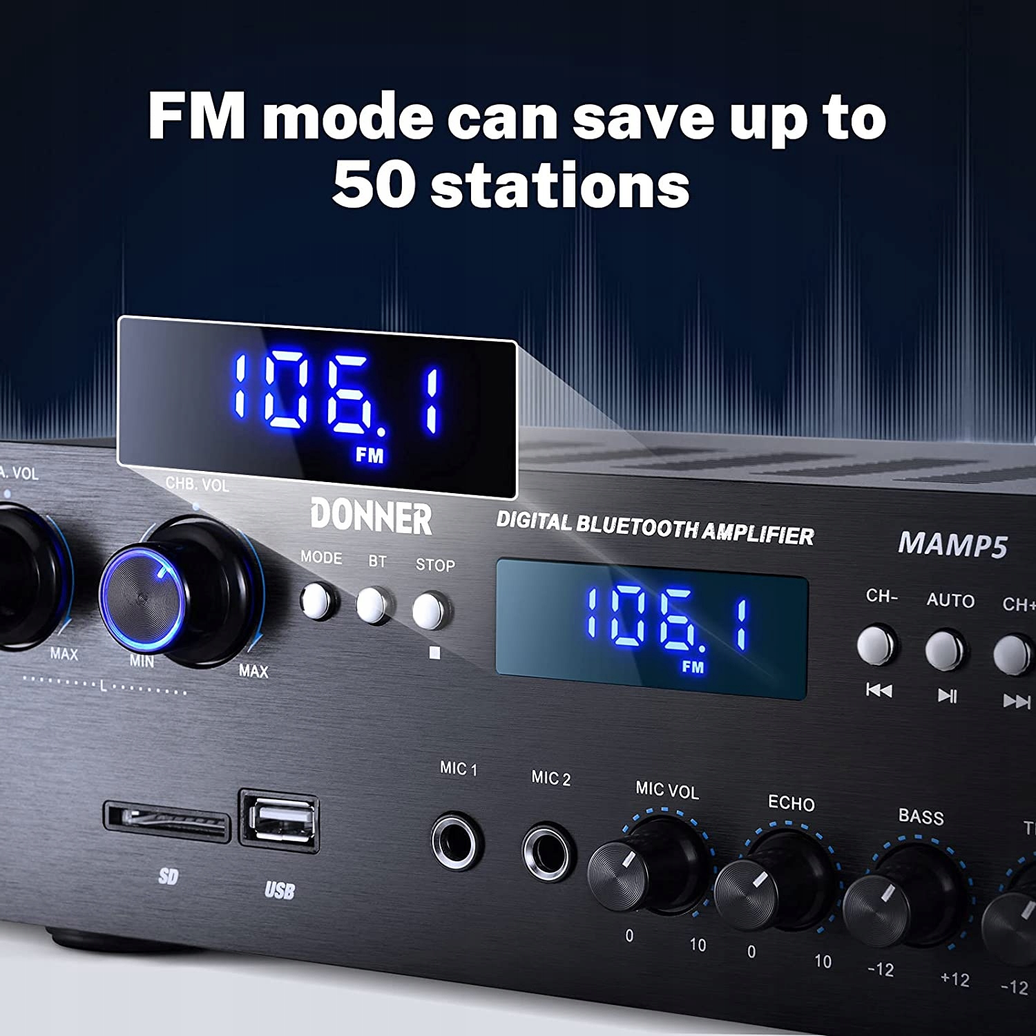 - HD Screen: интегрированный приемник для домашнего стереоподобного набора имеет встроенный светодиодный дисплей. ФМ антенна и пульт дистанционного управления включены в пакет стерео усилителей для регулировки звука расстояния. [Примечание] Чтобы воспроизвести звук, продукт должен быть подключен к пассивным динамикам. Когда динамик не будет подключен, будет определенный шум ветра, который является нормальным