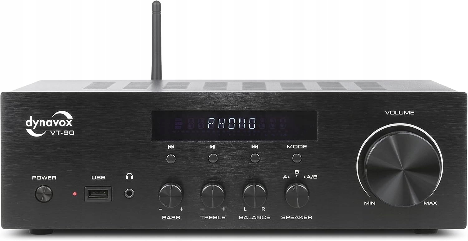 Dynavox Stereo Compact VT-90 усилитель, болтовые клеммы подключения до 4 динамиков, пульт дистанционного управления, вход FONO, потоковая передача BT, черный