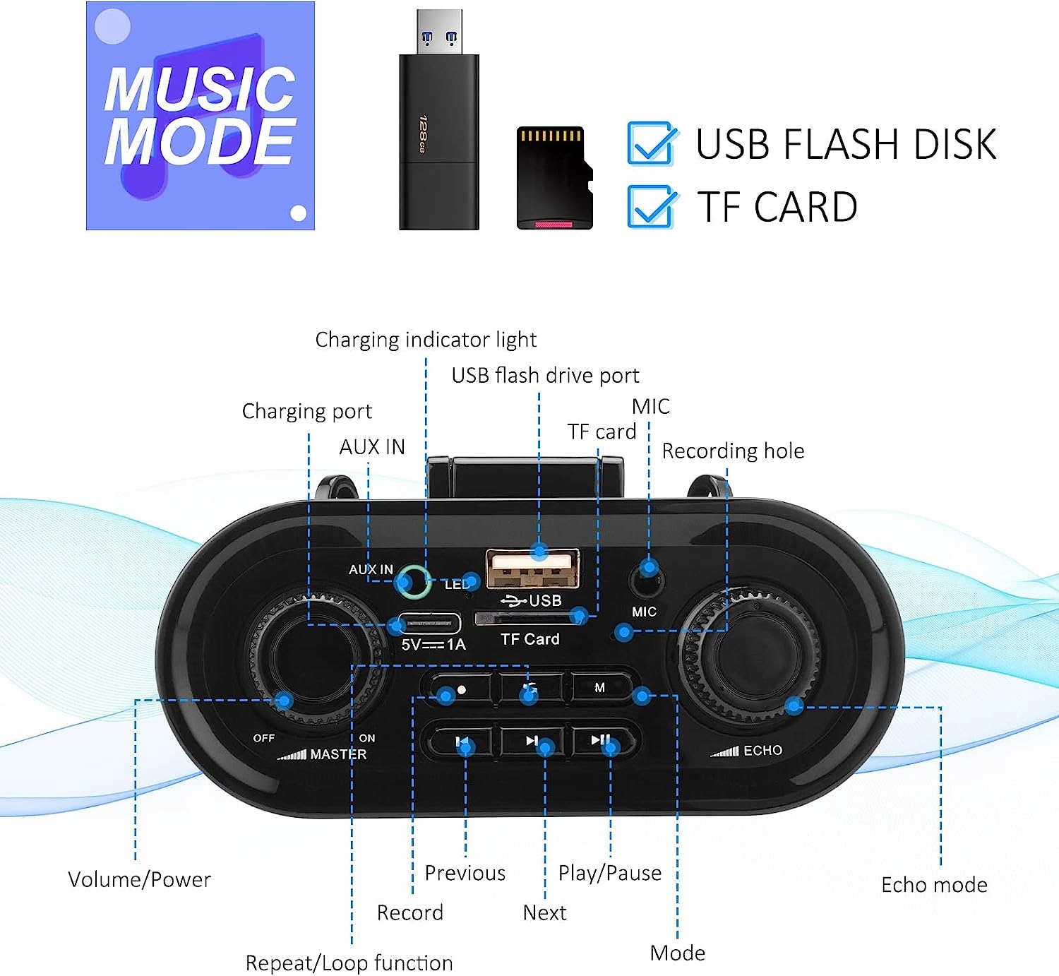 Многофункциональный усилитель голоса: усилитель голоса с микрофонной системой является хорошим голосовым помощником в классах, на станциях метро и на открытом воздухе, поддерживая FM-радио, запись, регулировку эха и дополнительный вход 3,5 мм, TF-карту и USB
