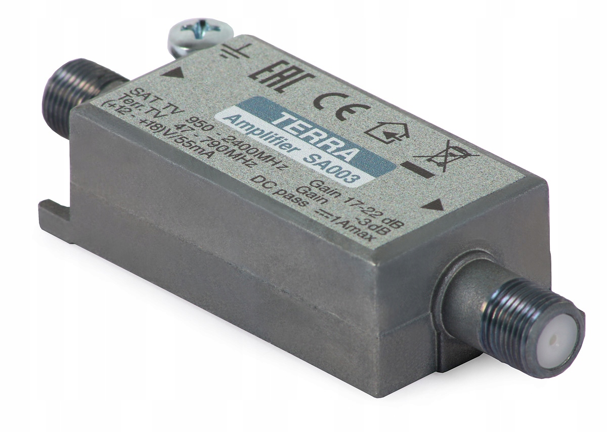 Усилитель SA003 предназначен для укрепления сигналов спутникового телевидения в полосе 950 МГц - 2400 МГц в установке RTV/SAT. Модель SA003 рекомендуется для укрепления сигнала от спутникового преобразователя до одного приемника и в установках с несколькими транспортными средствами, в которых слишком длинные расстояния вызывают уменьшение сигнала ниже порога чувствительности тюнера.
