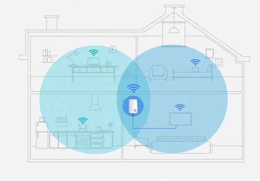 Усилитель оснащен 5 светодиодами, показывающими силу принимаемого беспроводного сигнала, что помогает определить подходящее место для размещения устройства для достижения максимального радиуса действия и производительности беспроводных соединений.