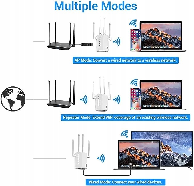 Этот удлинитель Wi-Fi поддерживает три режима для точки доступа/ретранслятора/маршрутизатора для удовлетворения различных требований пользователя. В качестве ретранслятора Wi-Fi устройство можно использовать в качестве точки доступа для преобразования проводной сети в беспроводную. Его также можно использовать в качестве маршрутизатора для передачи сигналов Wi-Fi на другие сетевые устройства.