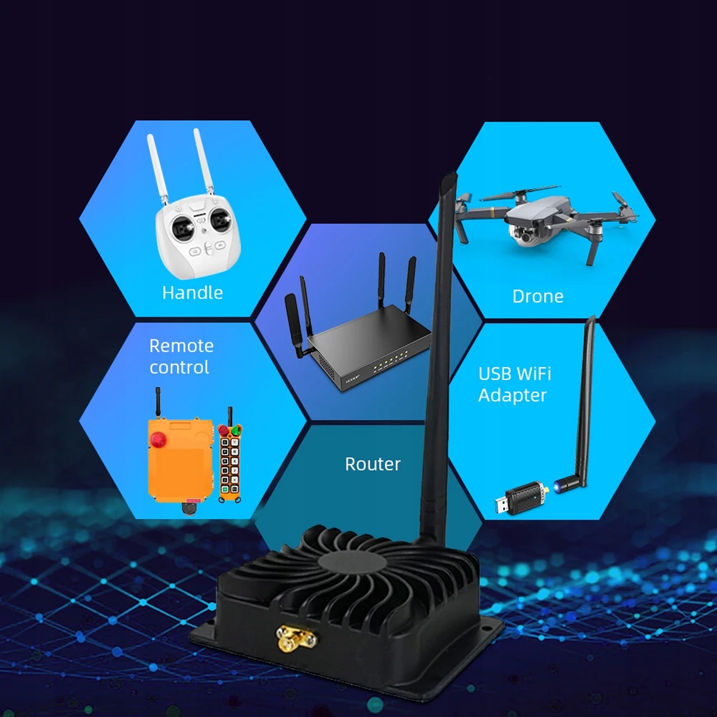 У вас есть проблема с плохим покрытием Wi-Fi дома, в офисе или при использовании дрона? Этот мощный усилитель сигнала Wi-Fi на частоте 2,4 ГГц и мощностью 8 Вт (39 дБм) — идеальное решение! Разработанный для увеличения эффективной дальности и радиуса действия вашей беспроводной сети, он гарантирует стабильное и надежное соединение даже в зонах со слабым сигналом, проникающим сквозь стены и препятствия. Простой в установке, это незаменимый инструмент для всех, кому нужен более сильный сигнал Wi-Fi.