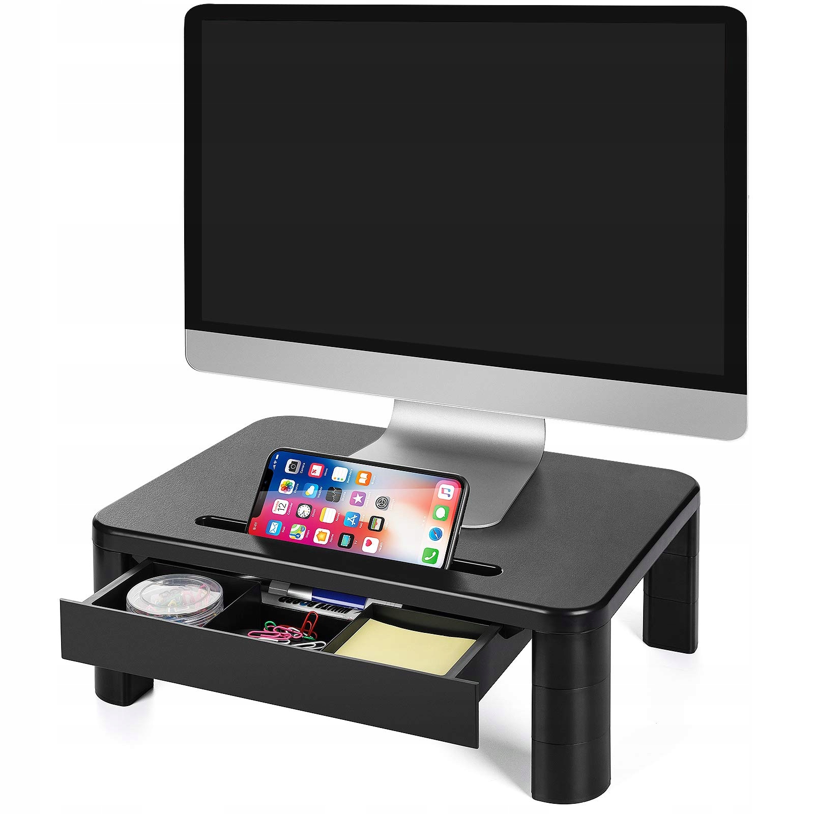 - 【Просторное рабочее место】В многофункциональный слот на платформе можно положить смартфон, планшет и ручку, чтобы держите свой стол в чистоте и порядке. Пространство под подставкой монитора позволяет хранить канцелярские принадлежности и расширять рабочую зону.
