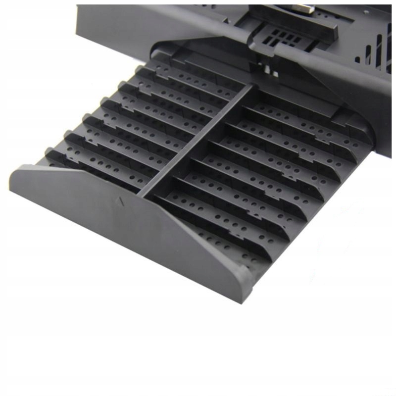 Подставка позволяет разместить консоль PlayStation 4, PlayStation 4 SLIM или PlayStation 4 PRO на боковой стене. Это экономит место. Подставка изготовлена из прочного пластика, поэтому ее можно использовать годами. Подставка оснащена двумя вентиляторами для охлаждения консоли. Станция включает в себя 2 док-станции для их зарядки. Дополнительно он оснащен 3 портами USB и подставкой на 14 игр. Товар совершенно новый.