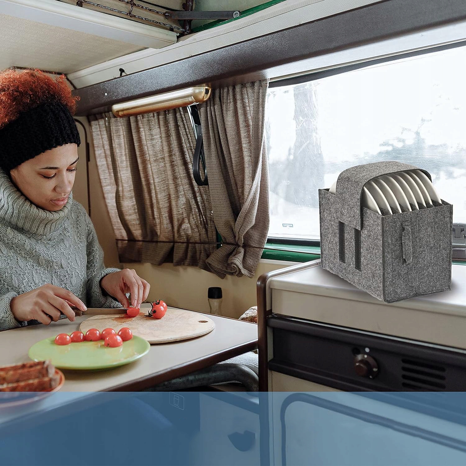 🚗🚗🚗 【Широкое применение】 Идеально подходит для кемперов, караванов и автодомов. Практичный фетровый органайзер для ящиков, шкафов и полок. Подходит для круглых, квадратных, больших и маленьких тарелок и даже суповых тарелок. Ручка для удобства переноски и транспортировки.