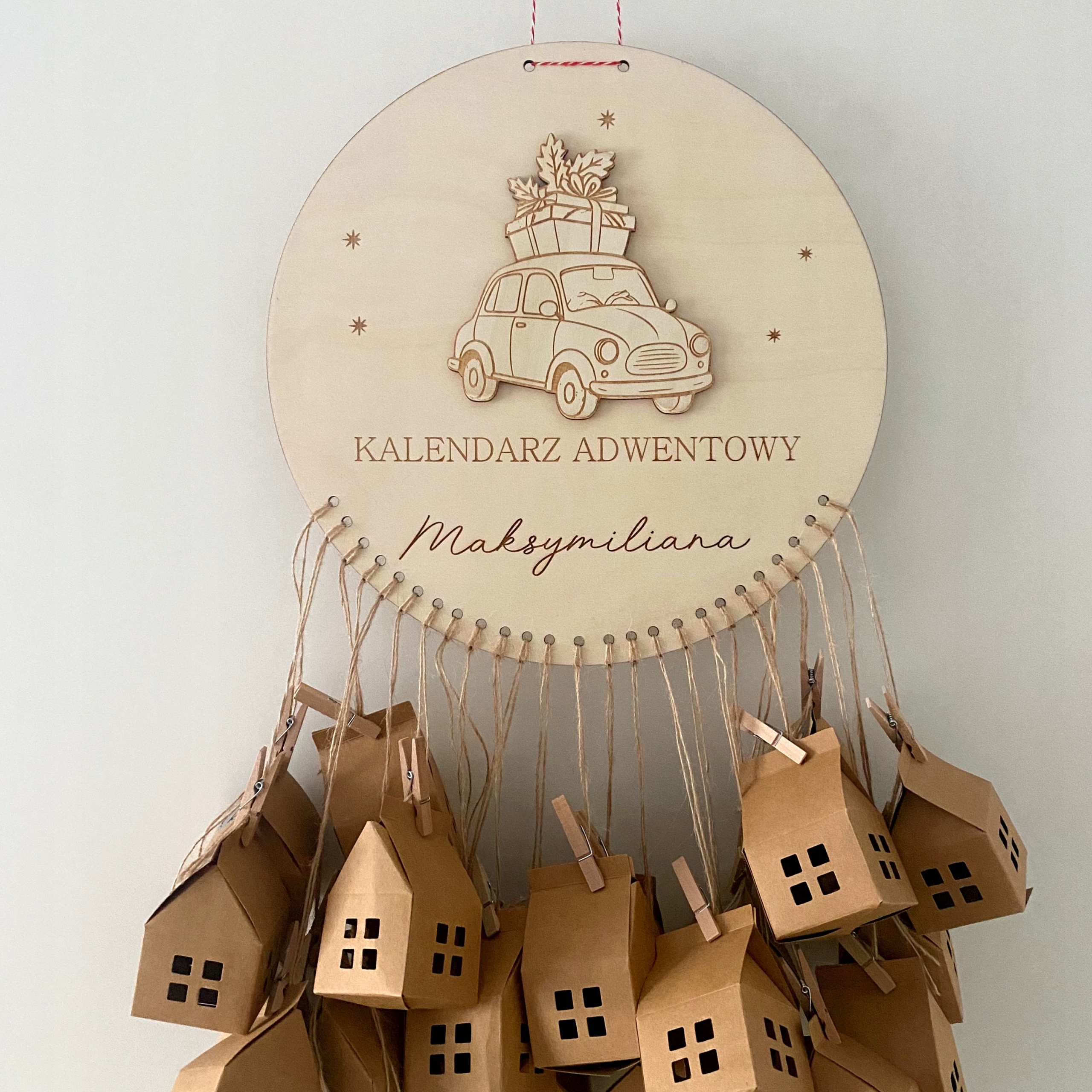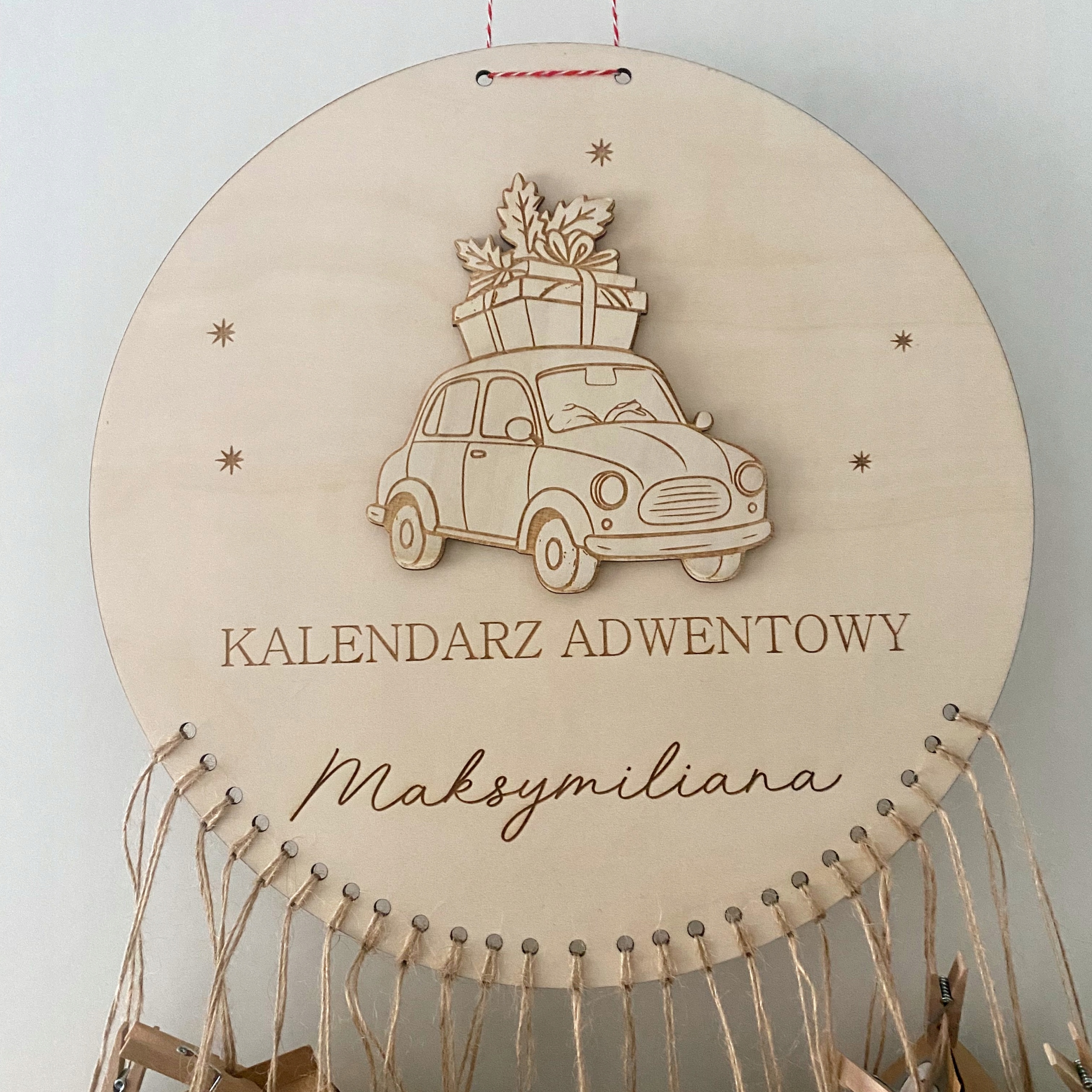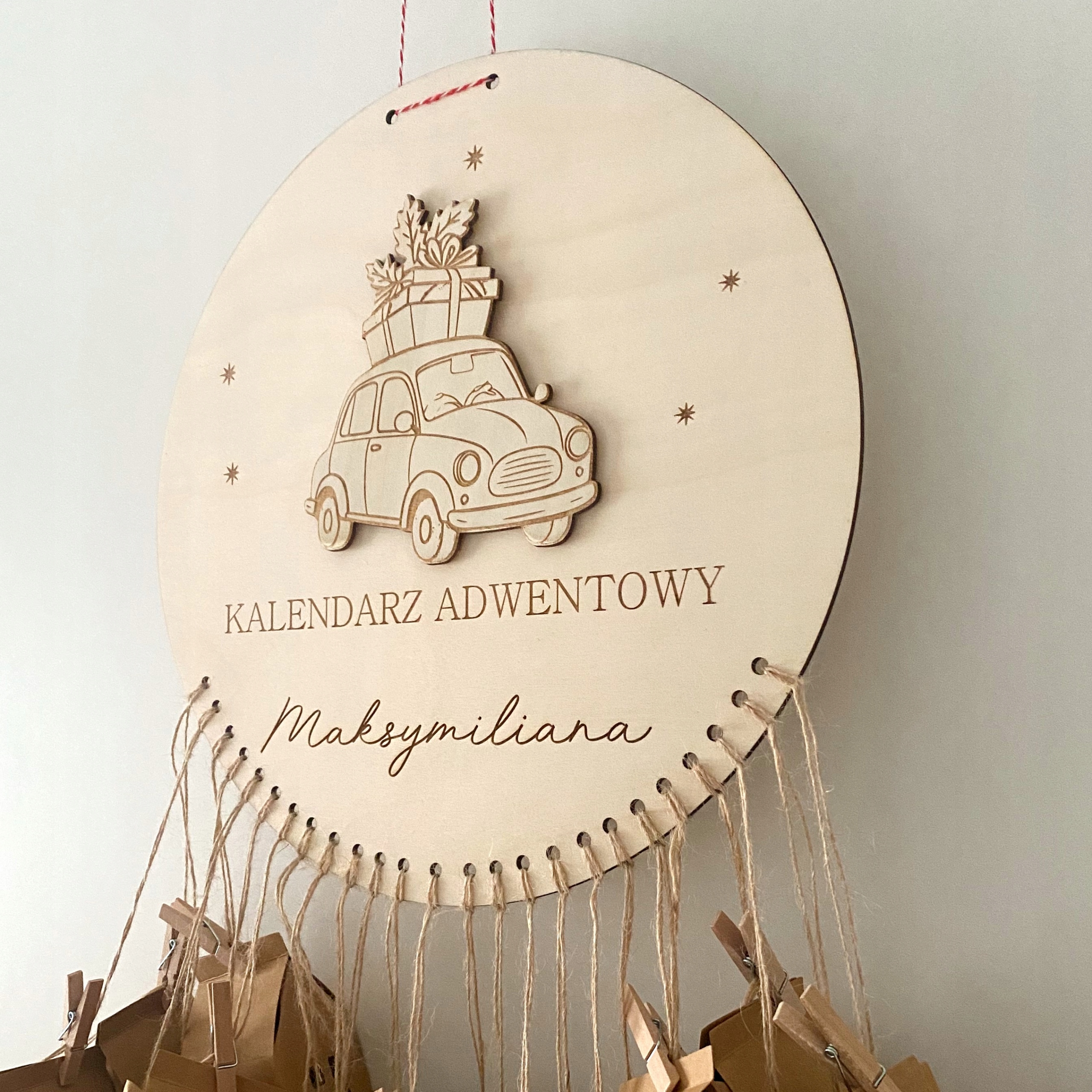 ДЕРЕВЯННАЯ ПОДСТАВКА АДВЕНТ-КАЛЕНДАРЯ С МАШИНКОЙ С ИМЯ РЕБЕНКА
