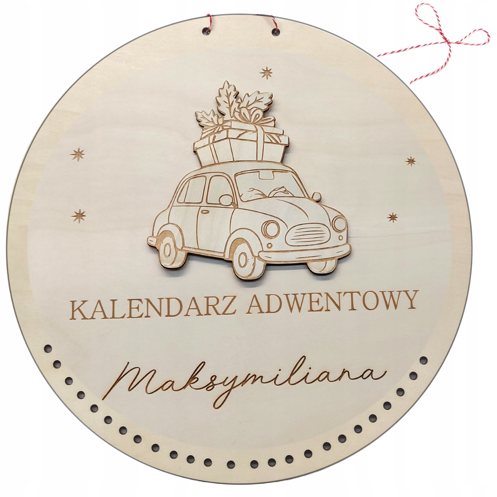 ДЕРЕВЯННАЯ ТАРЕЛКА АДВЕНТ-КАЛЕНДАРЬ НА ОСНОВЕ С ГРАВИНОЙ ДЛЯ РЕБЕНКА, КРУГЛАЯ С МАШИНОЙ, 3D ЭФФЕКТ - ДИАМЕТР 30 СМ