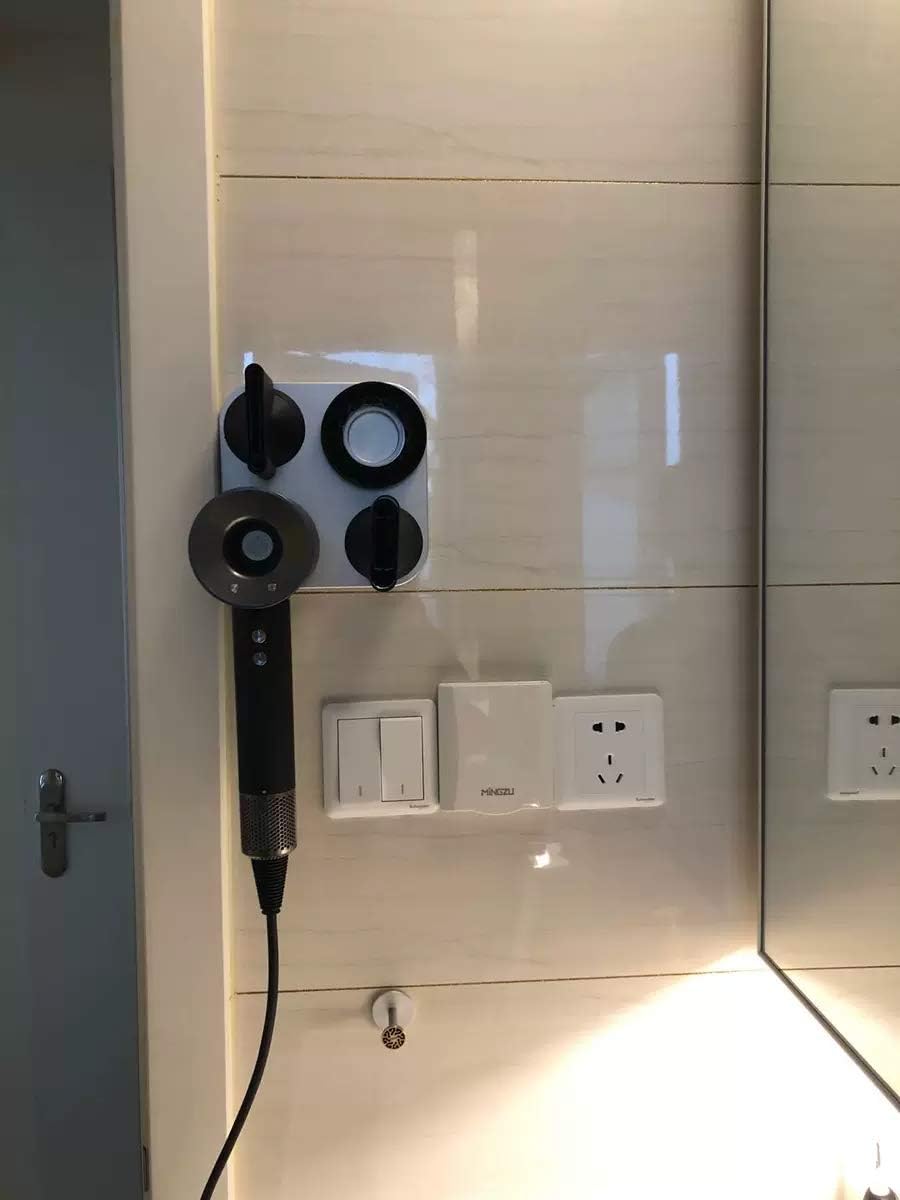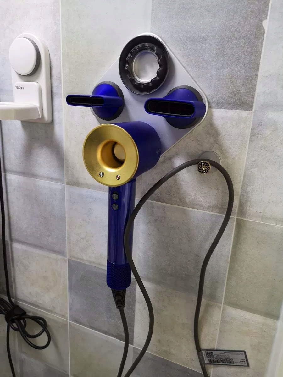 Металлический настенный держатель для фена Dyson. Вмещает фен Dyson и 3 насадки. Использование поверхности стены для хранения экономит поверхность стола, которая становится аккуратной, красивой и простой в эксплуатации.