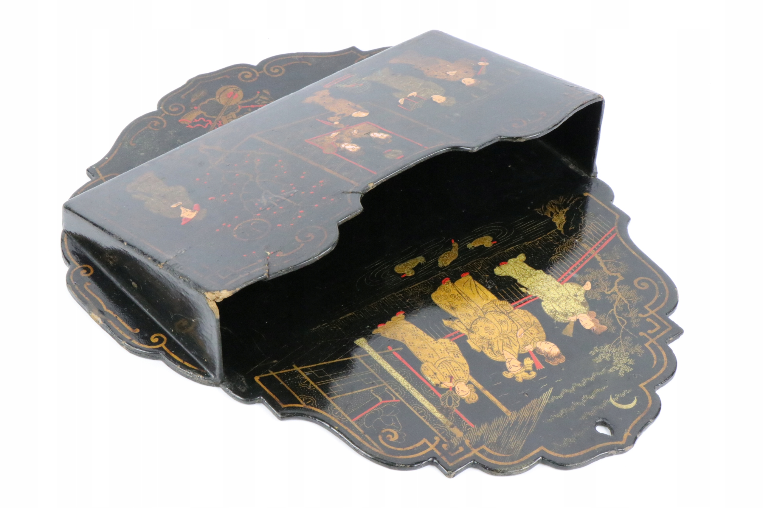 Китайская подставка для букв из лака и папье-маше, расписанная вручную жанровой сценой. Почтальон, викторианский период, когда предметы подобного стиля были очень популярны в Англии и Европе. Орнамент очень аккуратно расписан золотой краской. Предмет коллекционирования.