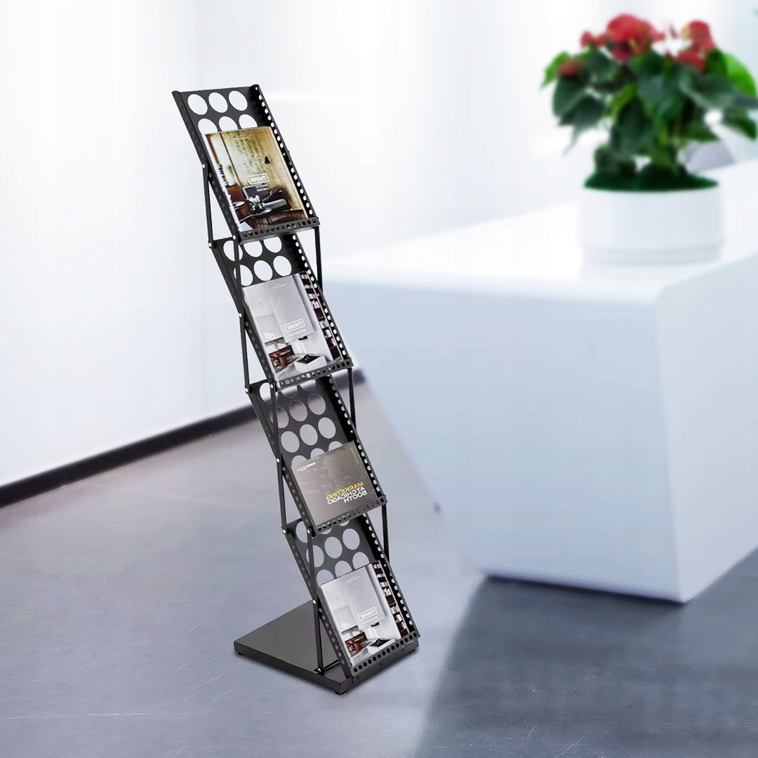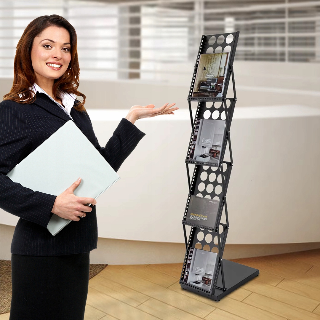 Складная подставка для листовок А4 – это практичное и эстетичное решение для демонстрации каталогов, брошюр, буклетов, меню и фирменных папок. Благодаря 4 вместительным полкам и устойчивой стальной конструкции он идеально подходит для офиса, магазина, ресторана, гостиницы, салона услуг, а также для выставок и конференций.