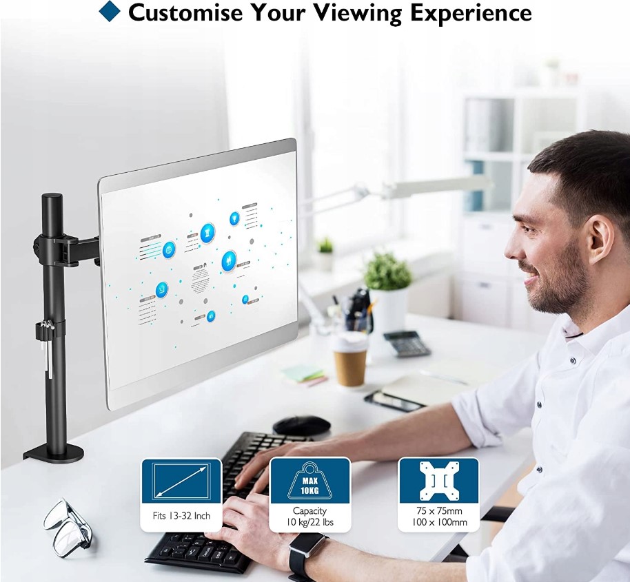Этот один кронштейн для монитора подходит для монитора с диагональю 13–32 дюйма и весом до 10 кг с креплением VESA размером 75 x 75 и 100 x 100 мм, что делает его идеальным для мест с ограниченным пространством.